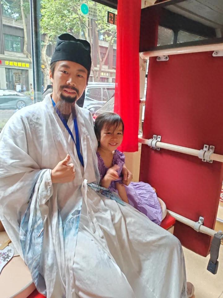 遊客均在巴士的二層落座,視野開闊。“李白”的出場特別“有範兒”,從一樓走上二樓。高呼:“仰天大笑出門去,我輩豈是蓬蒿人。”孩子們跟着一起歡呼,鼓掌歡迎。