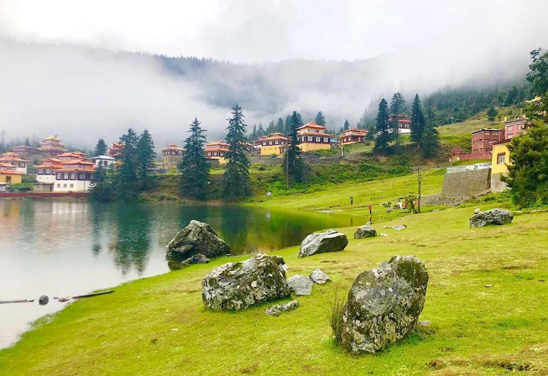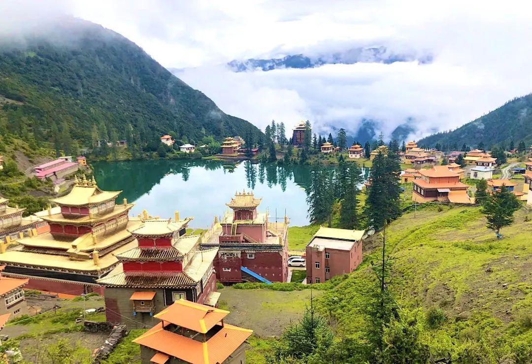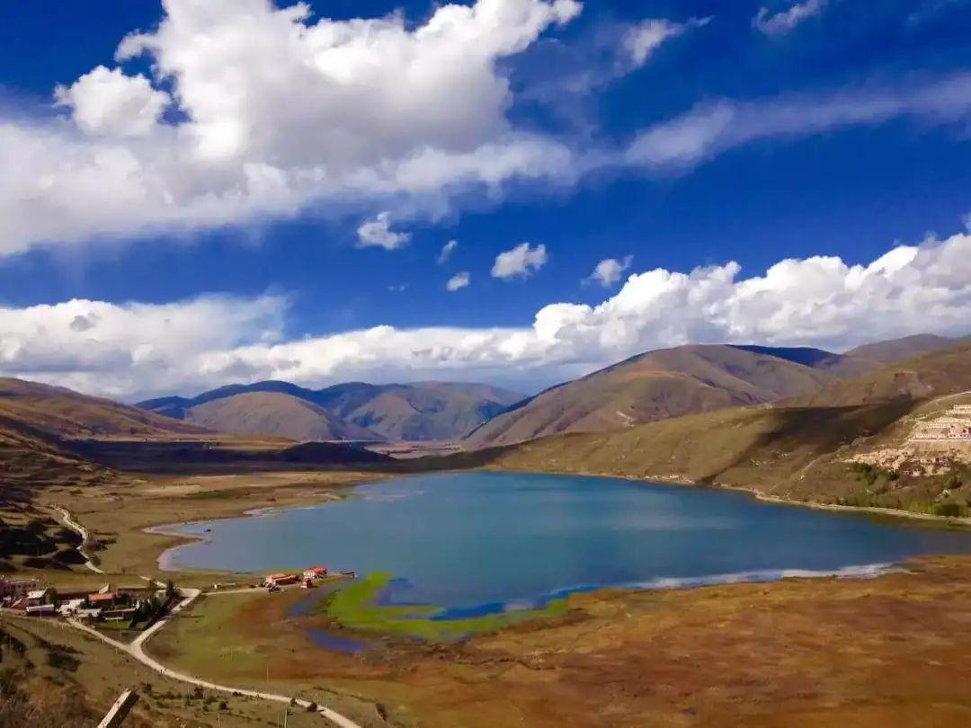 措卡湖在當地稱措卡海子,不足3平方公里的小湖泊,一圈金色寺廟建築將湖環抱其中,形成各個角度不同的自然景觀和人文景觀完美契合。