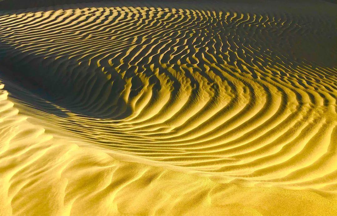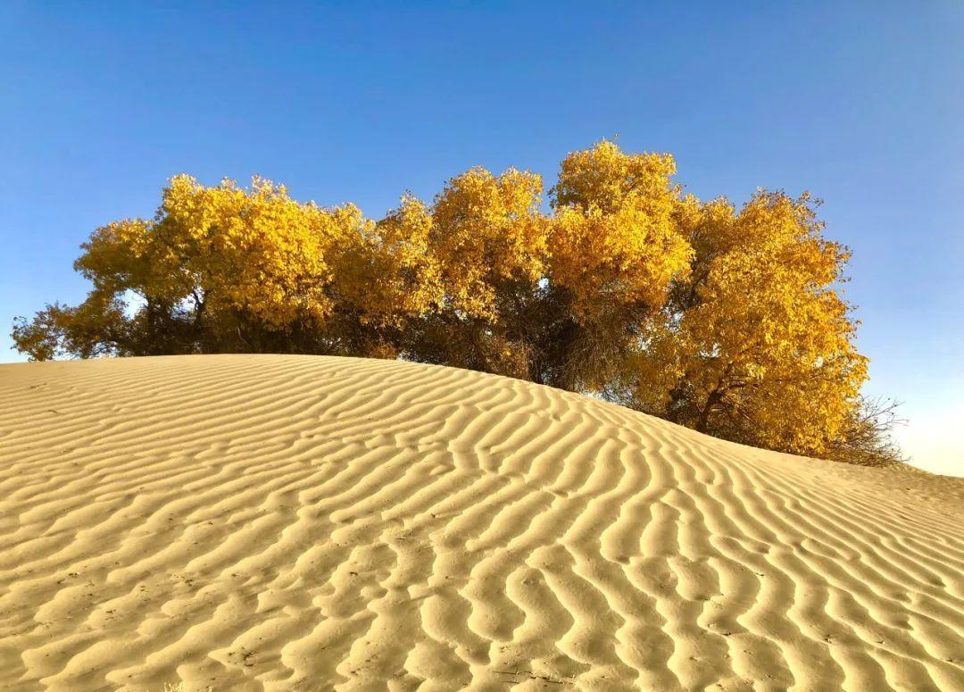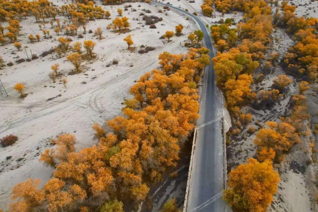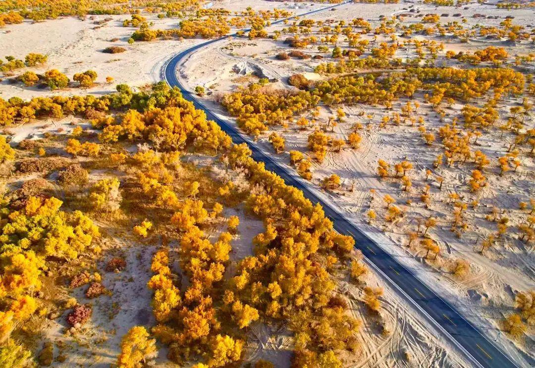 塔克拉瑪干沙漠,沿筆直望不到邊的沙漠公路,南北貫穿塔里木盆地。沿途風景壯美,除了大片金黃胡楊林,還有黃龍鬧海般的沙丘羣,其“鱗甲”在陽光下熠熠生輝,連綿起伏的沙丘以及散落在大漠深處的金黃胡楊,構成了一幅極有層次的畫面。