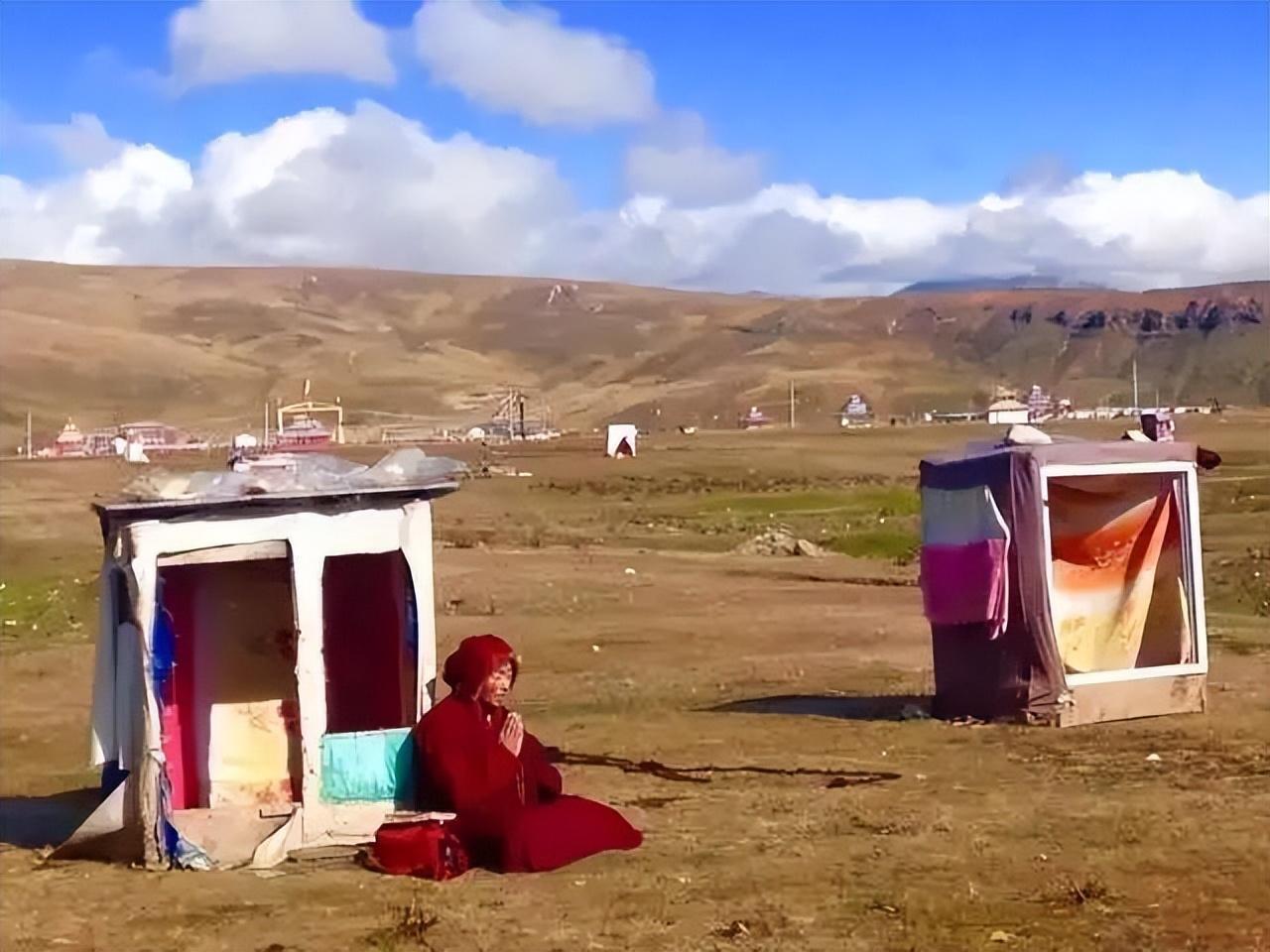 佛學院建在三面環山的大平底溝裏,環顧四周從溝底向山坡搭滿了密密麻麻的絳紅色藏式小房,層層疊疊一直漫延至山頂。絳紅色袈裟的僧人穿梭於房隙,遊客則被淹沒在一片紅海中。