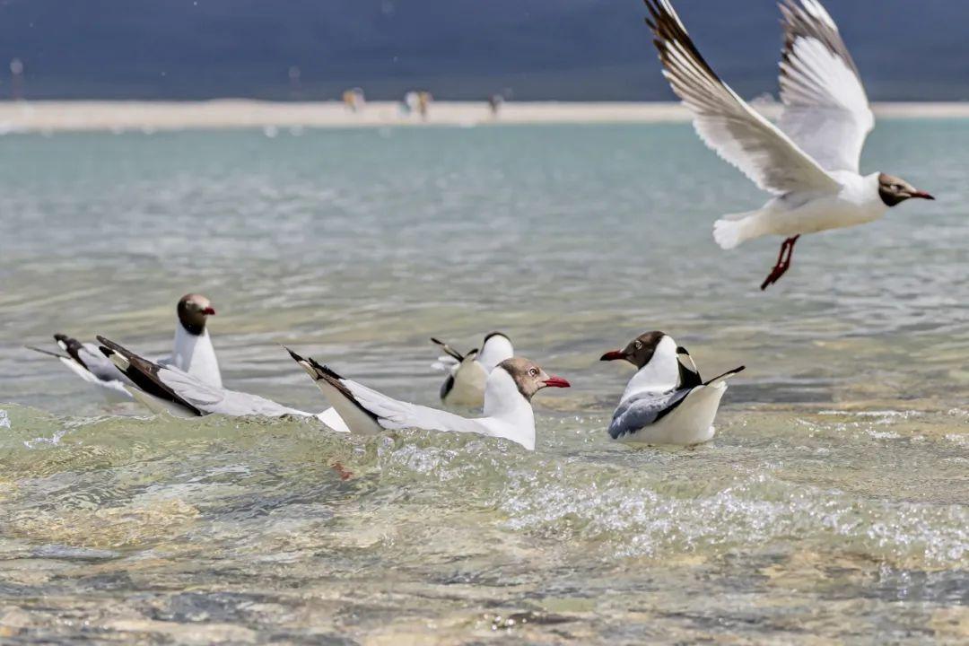 沿途經過乾溝,乾溝是連接南北疆的重要咽喉通道,公路兩旁一半沙漠一半怪石,沒有植被,或者說是寸草不生,故爲乾溝。路過博斯騰湖時,可以去博斯騰湖金沙灘喂海鷗,成羣的海鷗在湖裏飛翔,讓人心情愉悅。晚上可以去庫爾勒孔雀河邊看夜景。