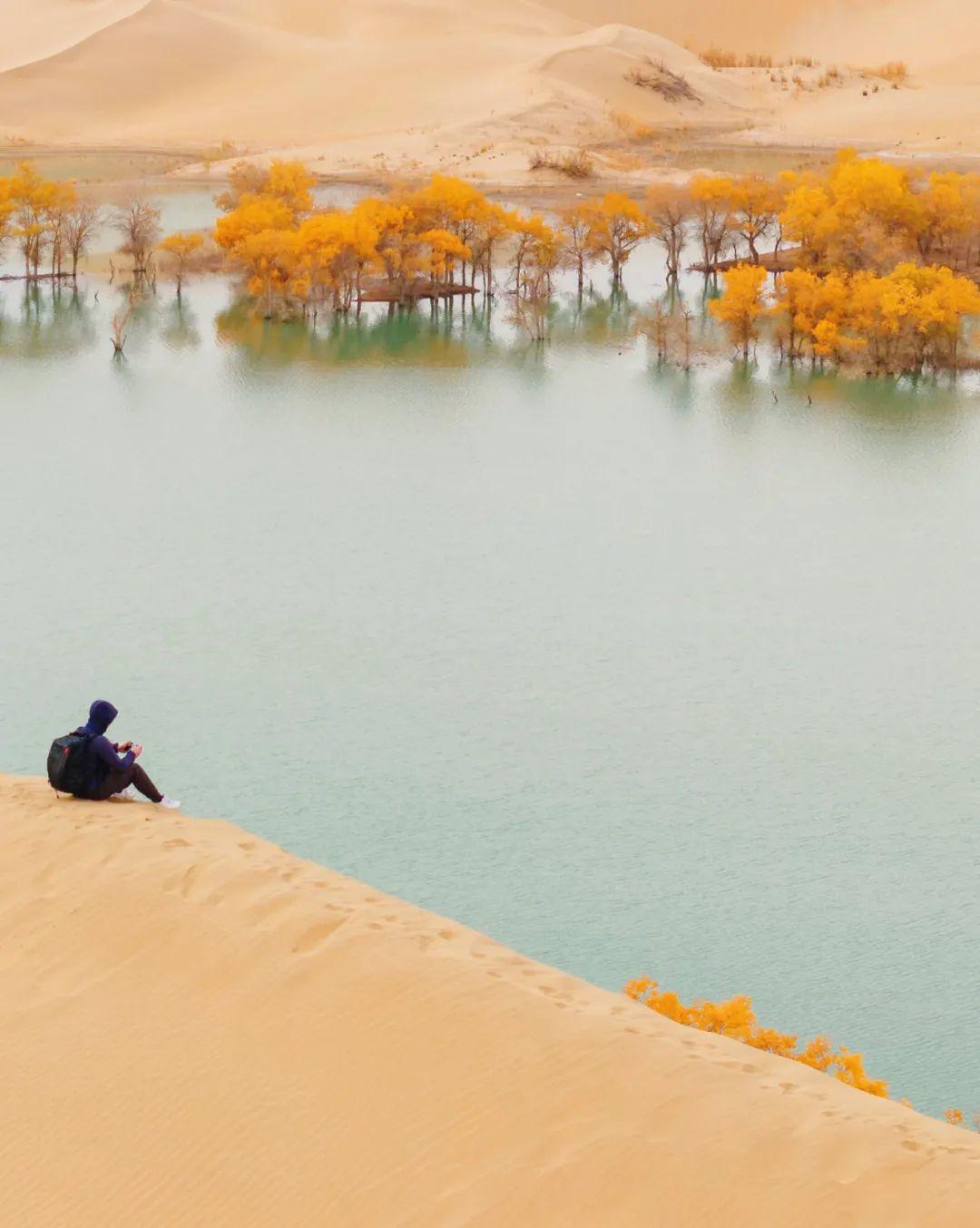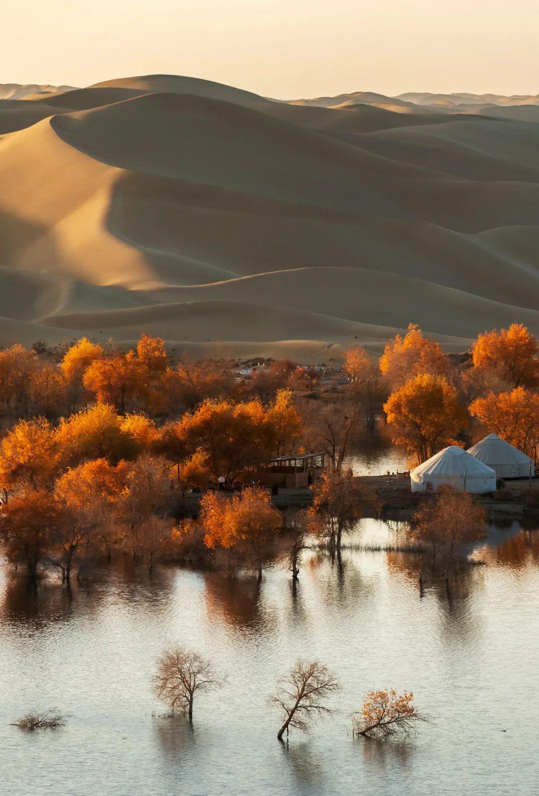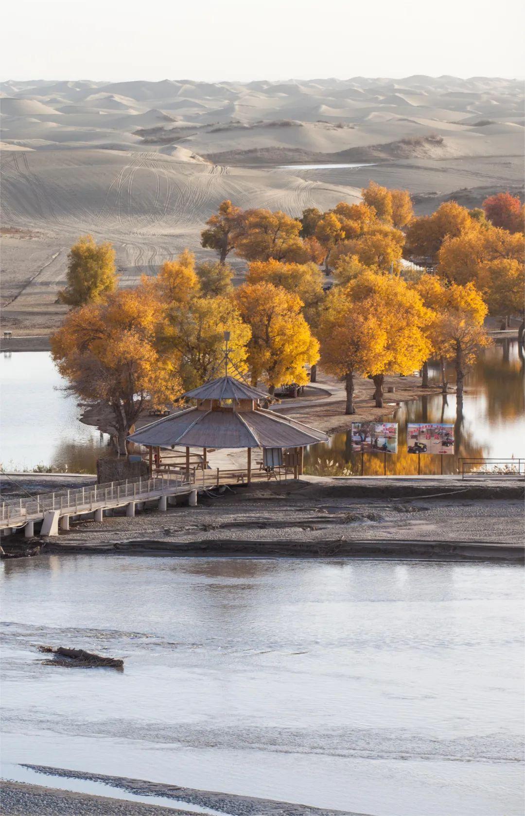胡楊、大漠、湖泊、河流相映生輝。