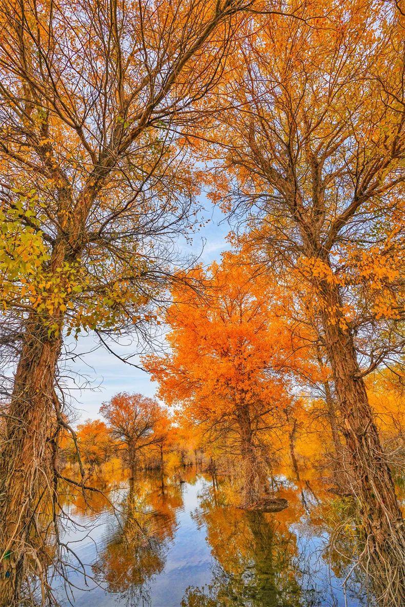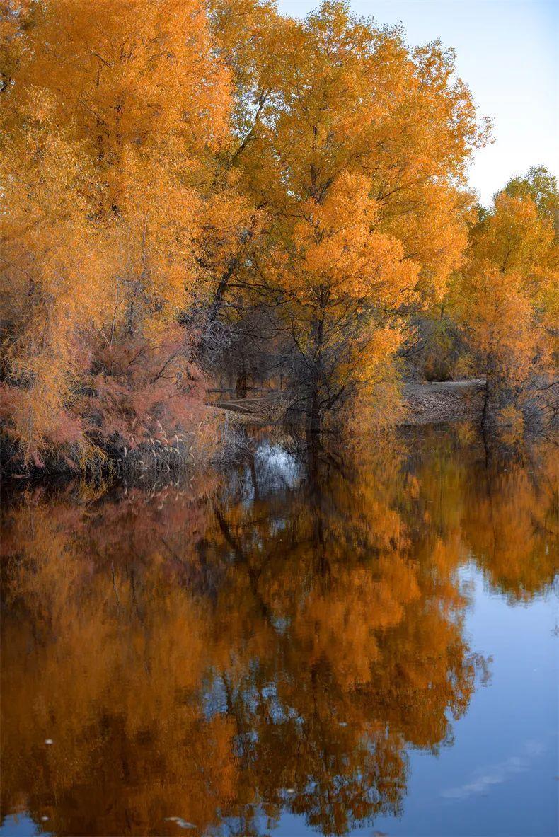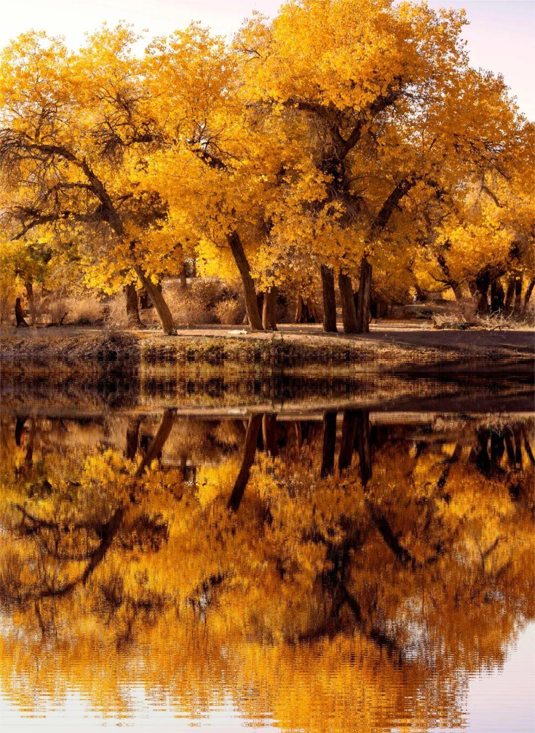 胡楊、大漠、湖泊、河流相映生輝。