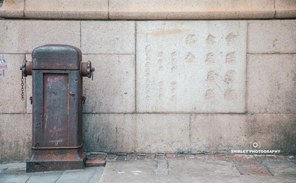 大門左側的外牆牆角還留着當時的消防栓(已廢棄不用),如今已經算是街頭古董了。消防栓旁邊十分模糊的石刻,是當年奠基時留下的“中國銀行大廈奠基紀念”銘牌。因有宋子文名字,在WG時遭到了剷除,因此現在只剩下難以辨認的字跡。