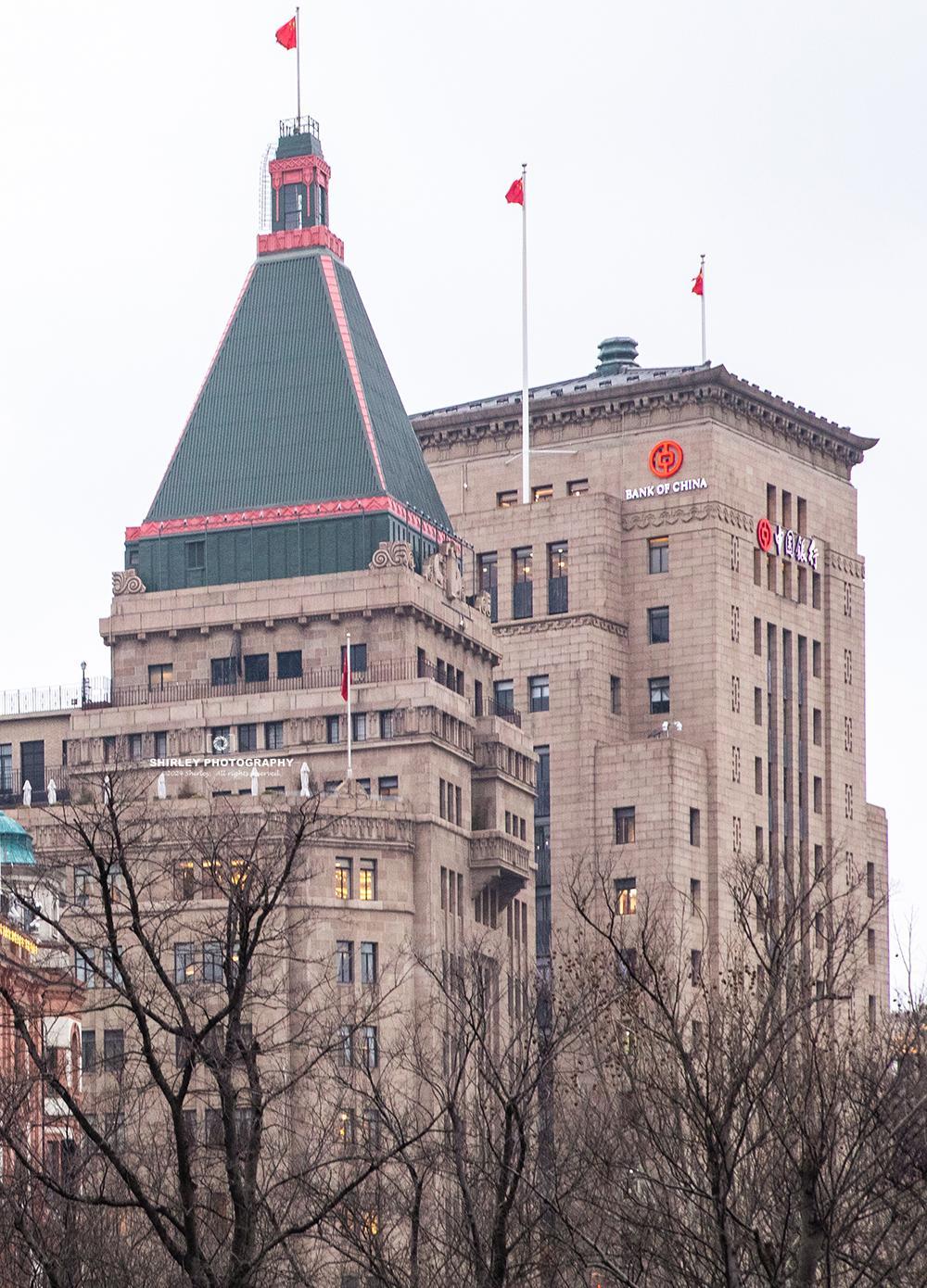 而工部局考慮到一旁沙遜大廈(外灘22號,今和平飯店)的顏面,利用各種手段迫使中行讓步。經過反覆談判,大樓只建到了17層,最終略低於沙遜大廈的塔尖。當時的中國人想了個辦法,在屋頂兩邊豎了兩根旗杆,就在視覺高度上超過沙遜大廈了。
