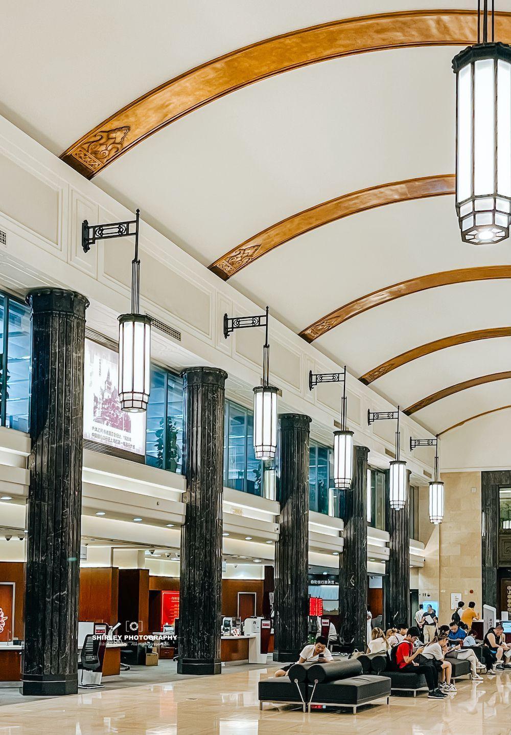 面積1300㎡,層高10米的大廳曾是遠東最大的銀行營業大廳,在規模、面積方面足以傲視外灘。營業大廳的弧形天花板跨度在外灘衆多老建築中也是首屈一指,讓人想到了中蘇友好大廈的大廳(現上海展覽中心)。據介紹,天花板上原來裝飾有“八仙過海”的圖案,可惜現已不存;兩側各有八根氣勢恢宏的立柱,黑色大理石在淺色調的大廳裏格外醒目。