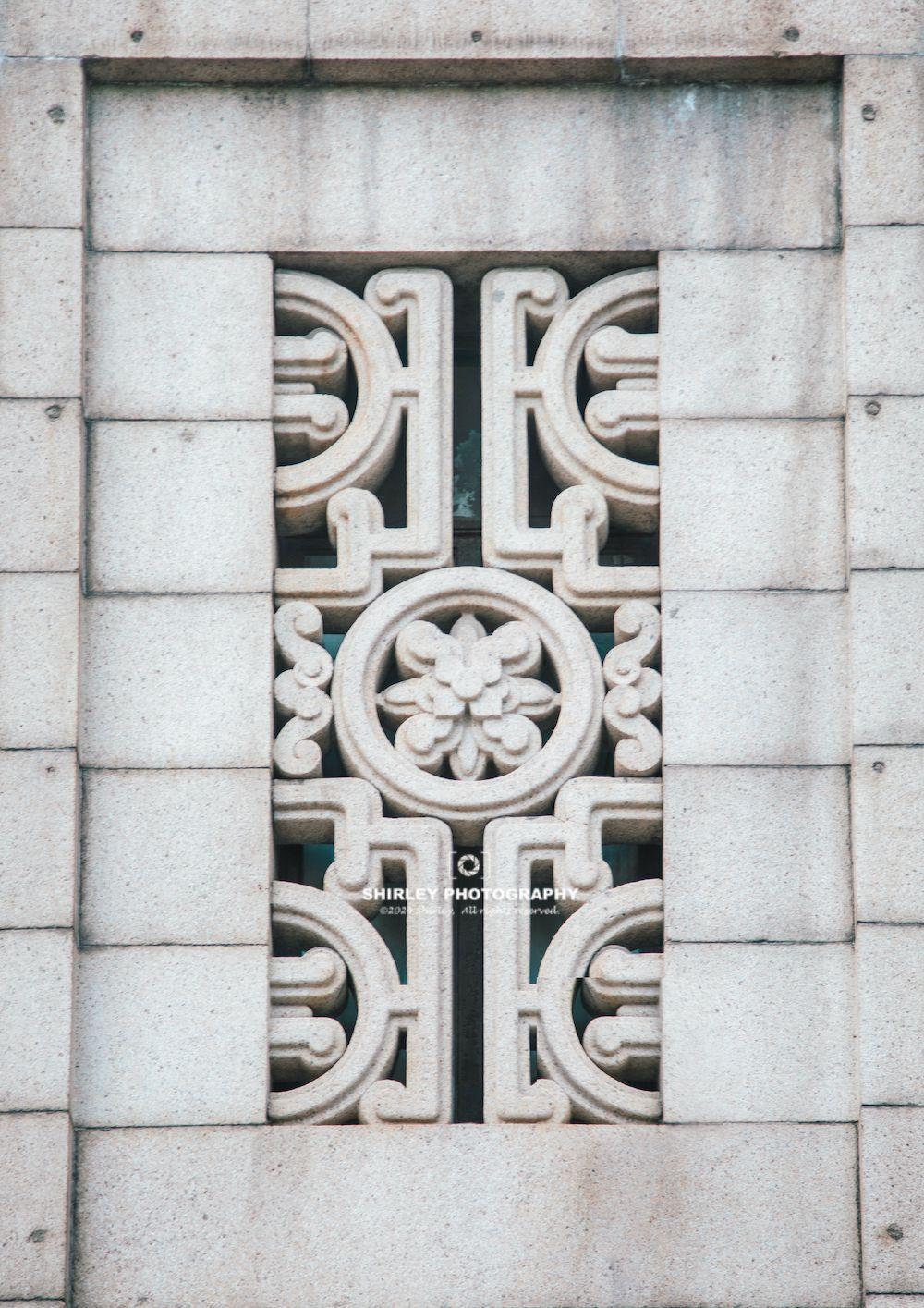 最氣派的是大樓的大門,門外有9級石階,兩扇紫銅圖案雕飾大門氣派非凡,爲外灘第一大銅門。高達十米牌樓式石砌門框,上方鐫刻着“中國銀行”四個石質柳體大字。大門上方有孔子周遊列國的石雕,能看到孔子端坐中央。兩側“中”字鏤空的石雕窗宛如一幅高高垂掛的對聯,門前一對神態威嚴的貔貅在周圍洋行留下的一衆銅獅面前獨樹一幟。