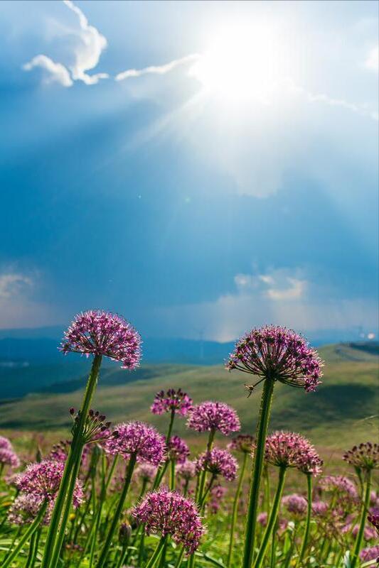 漫山遍野的韭菜花,追尋着太陽的足跡,一路盛放至雲端,耀眼絢爛極了。