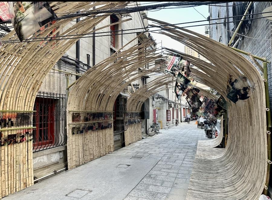 弄堂內有不少佈置訴說着此地的過往的歷史。最爲典型的就是入口處的盡頭,有一雕塑形如攤開的書籍,向過往路人介紹龍門邨的歷史沿革。入駐弄堂內的藝術工作室仁廬RenSpace偶爾也會舉辦公益展覽,這時候安靜的龍門邨裏會熱鬧一些。仁廬的設計師還在弄堂裏別出心裁地舉辦了露天攝影展,參展的老照片都是龍門邨的居民提供的。展覽喚醒了塵封的記憶,也傳達了市井生活裏濃濃的人情味。