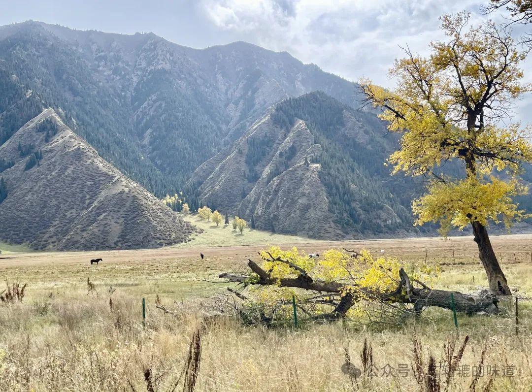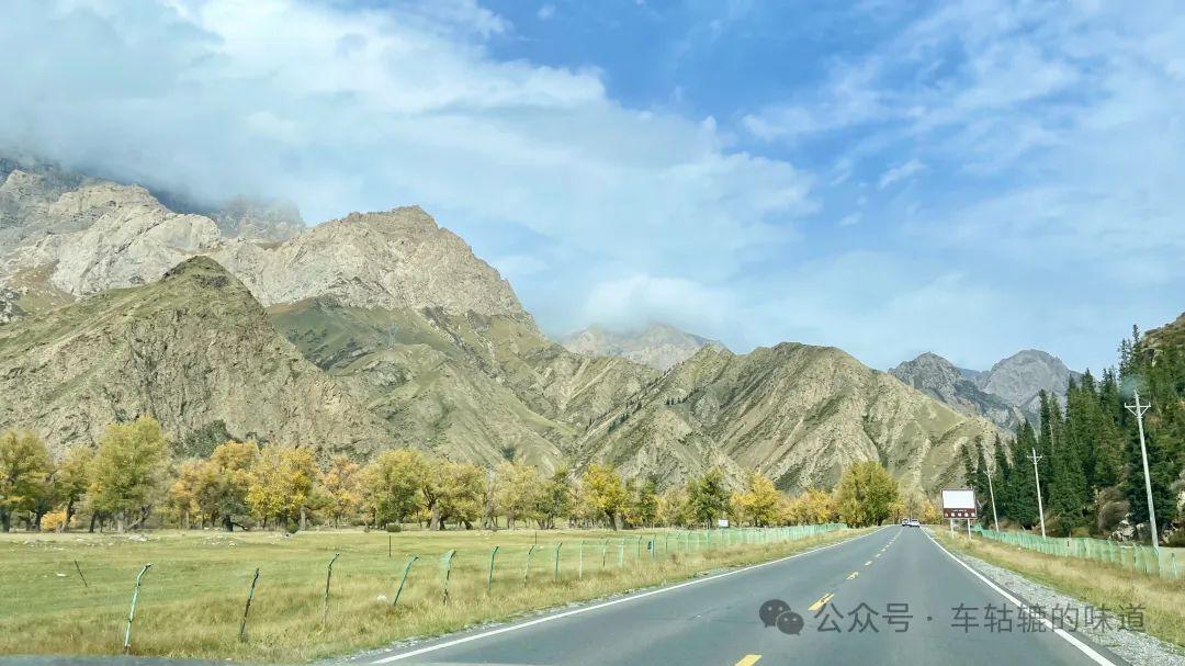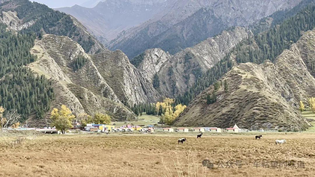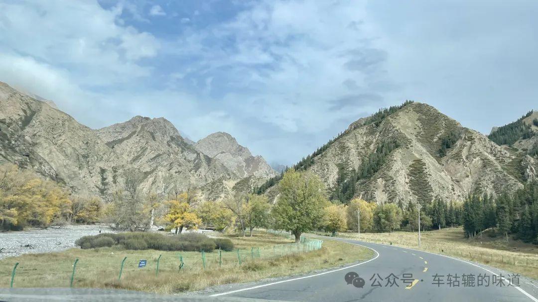 繼續沿着獨庫公路前行,過了一段峻峭起伏山體光禿禿的峽谷後,路邊開始出現了秋景圖,河灘上、山澗間被金黃色和綠色的草叢樹木點綴。