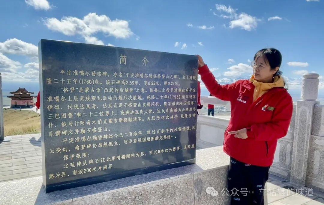 這座石碑由乾隆於公元1755年下令建立的,“漢置都護,唐拜將軍,費賂勞衆,弗服弗臣。既臣斯恩,既服斯義,勒銘格登,永詔億世!”石碑上的乾隆御筆氣勢雄偉,幷包含了漢字、滿文、蒙古文和藏文四種文字。