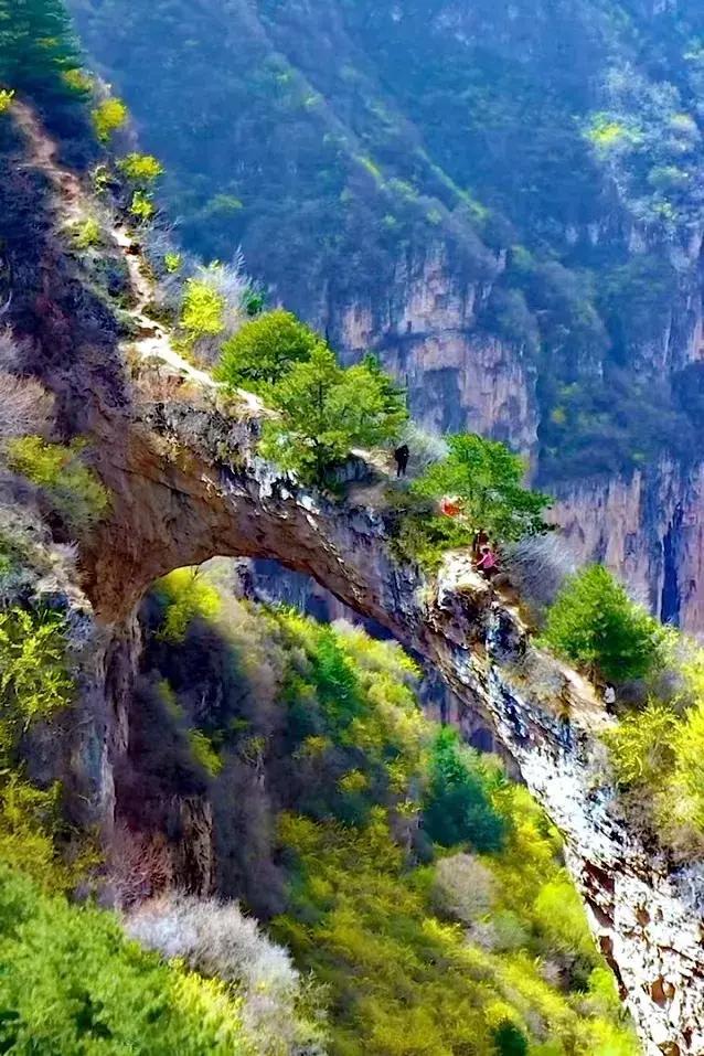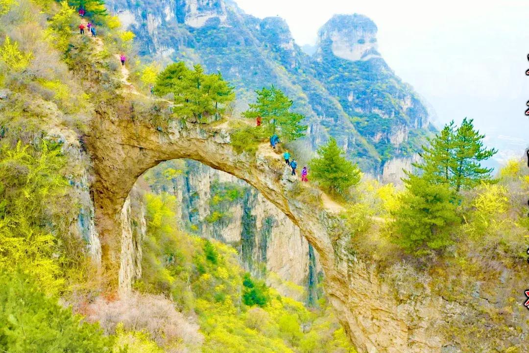 “天生橋”,它宛若一道巨大的山門橫跨山谷,橋拱十分規整,天橋寬約5米,厚6米,跨度50米,最大高度150米,它是華北最大的天然石拱橋。膽大的人向橋下俯瞰,拽着樹木,也有天旋地轉、山倒橋移之感,讓人不由得感嘆大自然的神奇魅力。