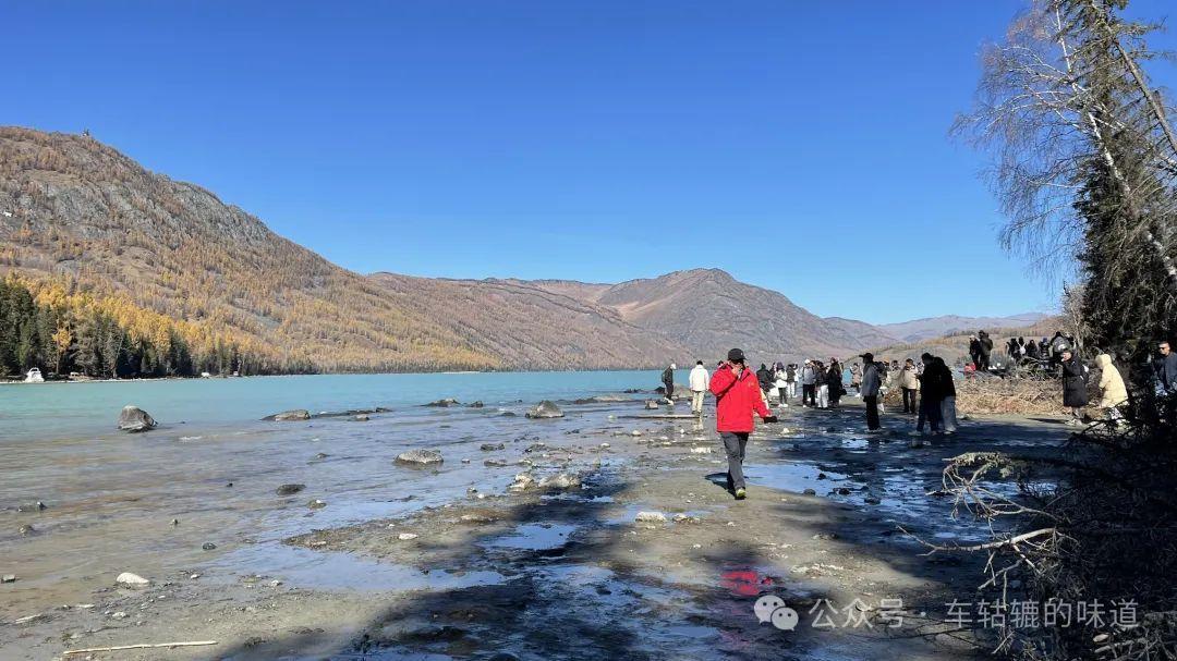 喀納斯湖是喀納斯的核心景點,我們在喀納斯遊客中心坐免費公交到喀納斯湖。湖水呈現出迷人的藍綠色,就像一塊巨大的寶石。