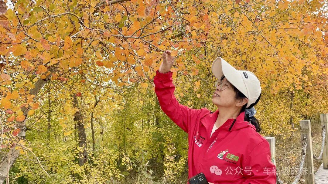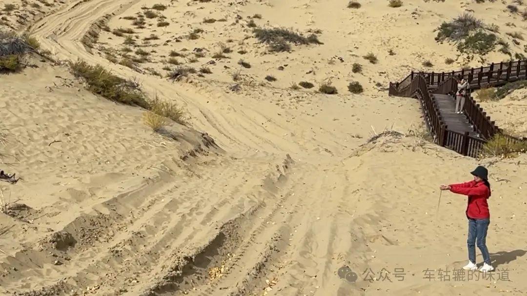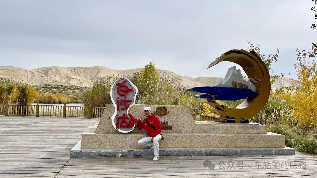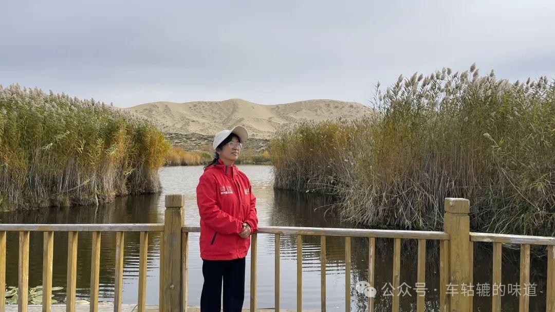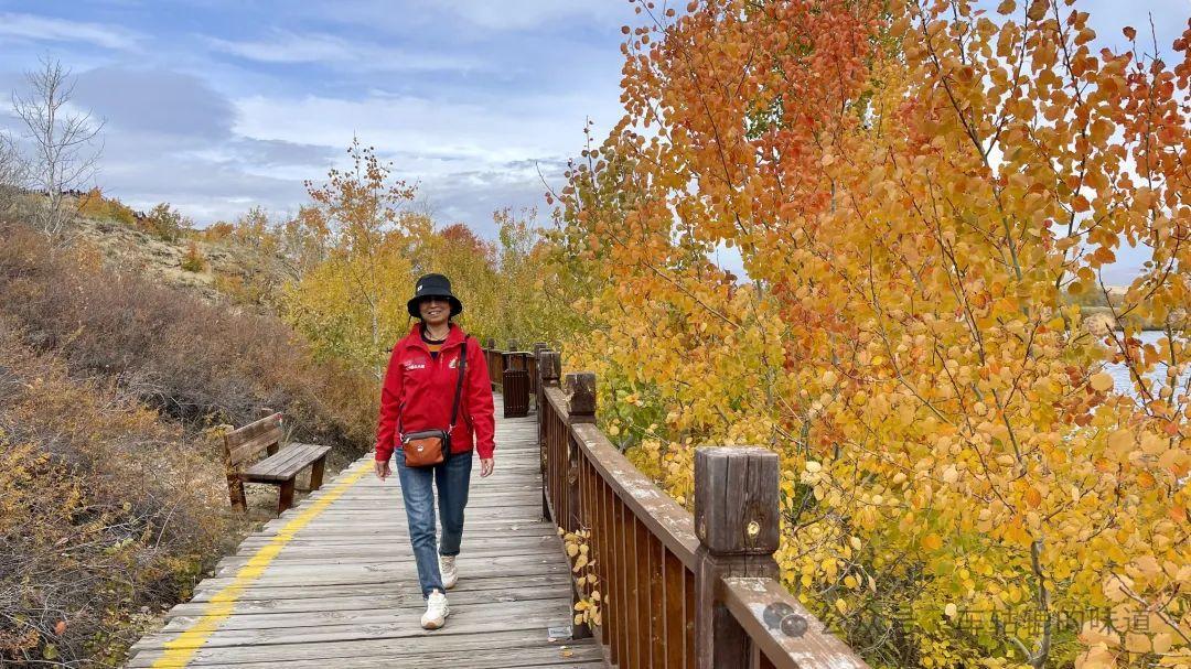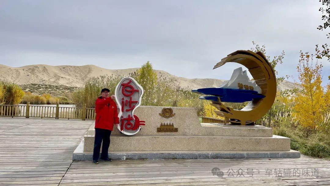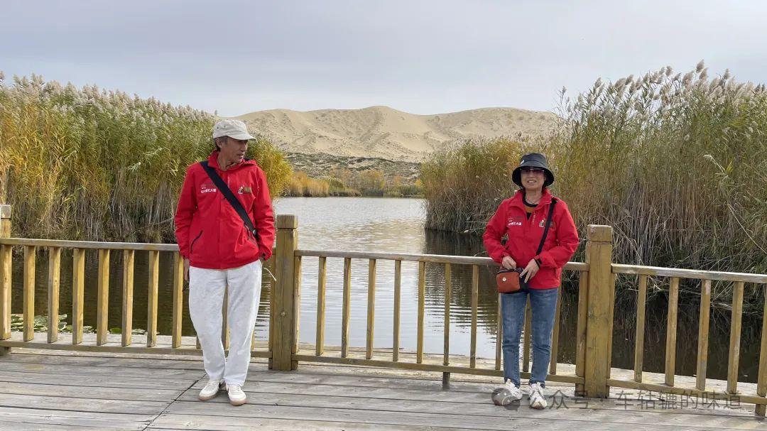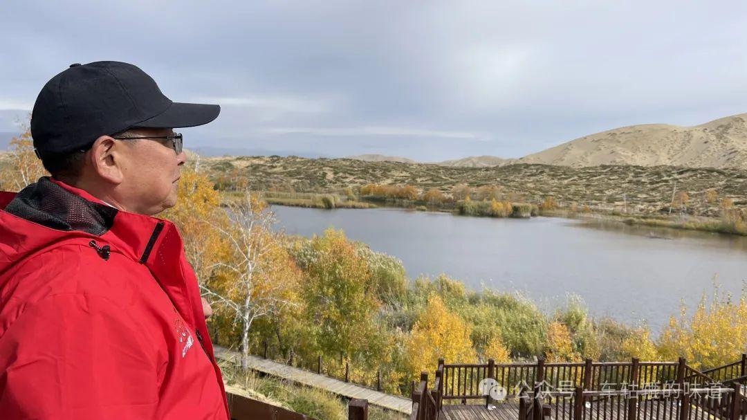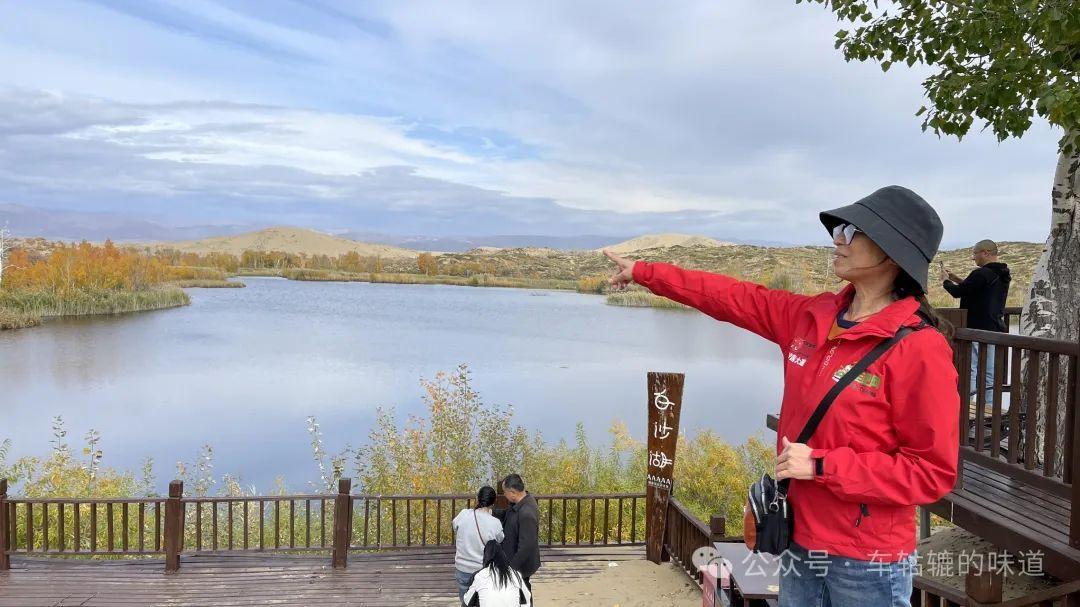 在觀景平臺上可以看到整個白沙湖的樣貌。白沙湖點綴在白色沙丘之間,像一個豌豆莢的形狀,清澈的湖水與環繞的沙漠交相輝映,湖邊的樹葉呈現出深淺不一的黃色、紅色和綠色,秋意盎然,風景十分美麗。