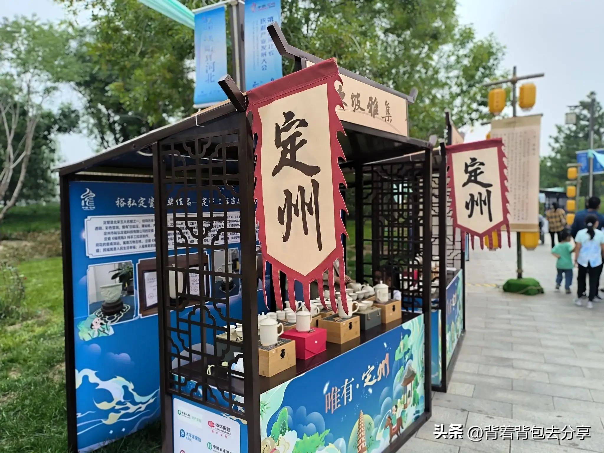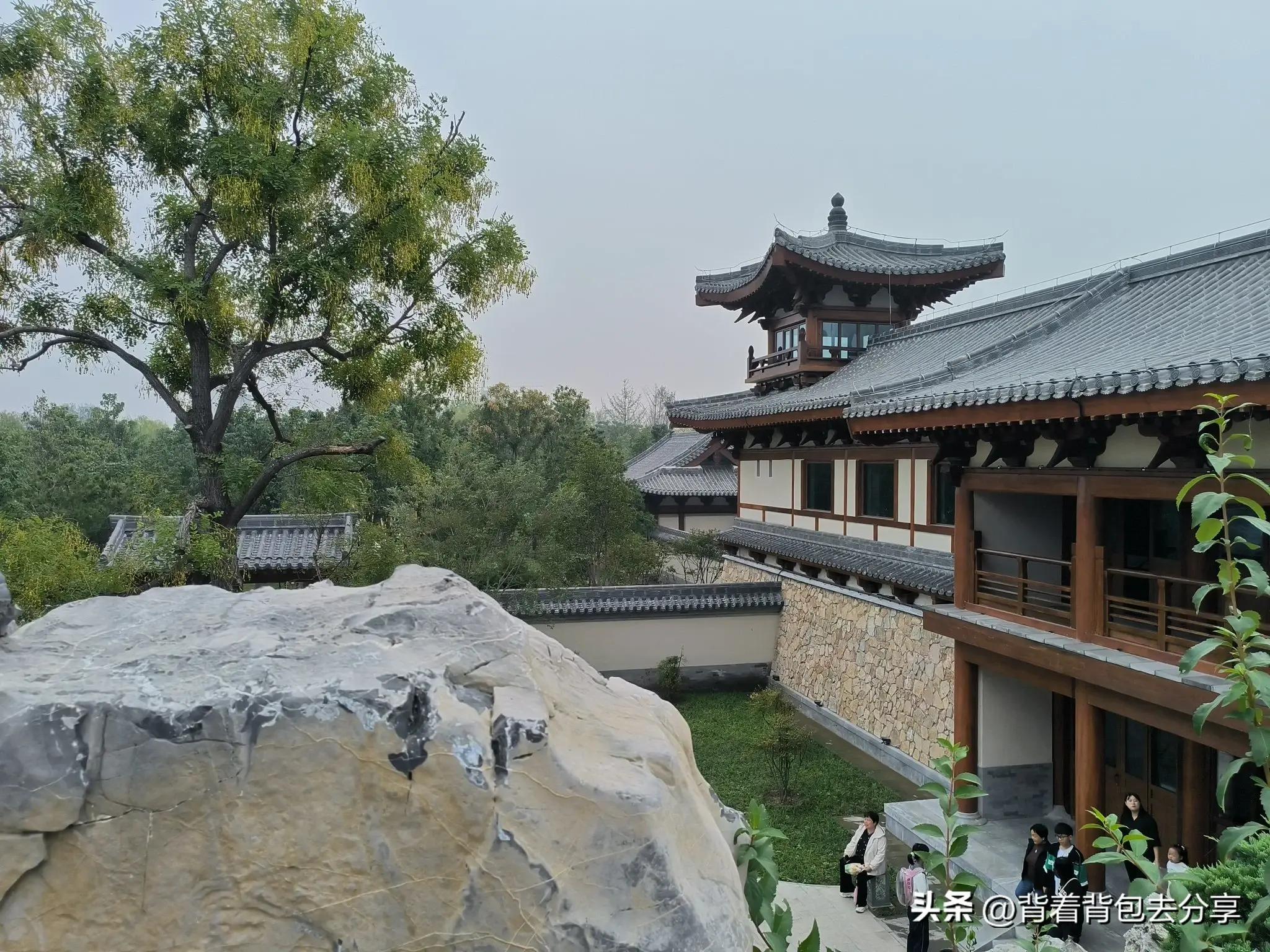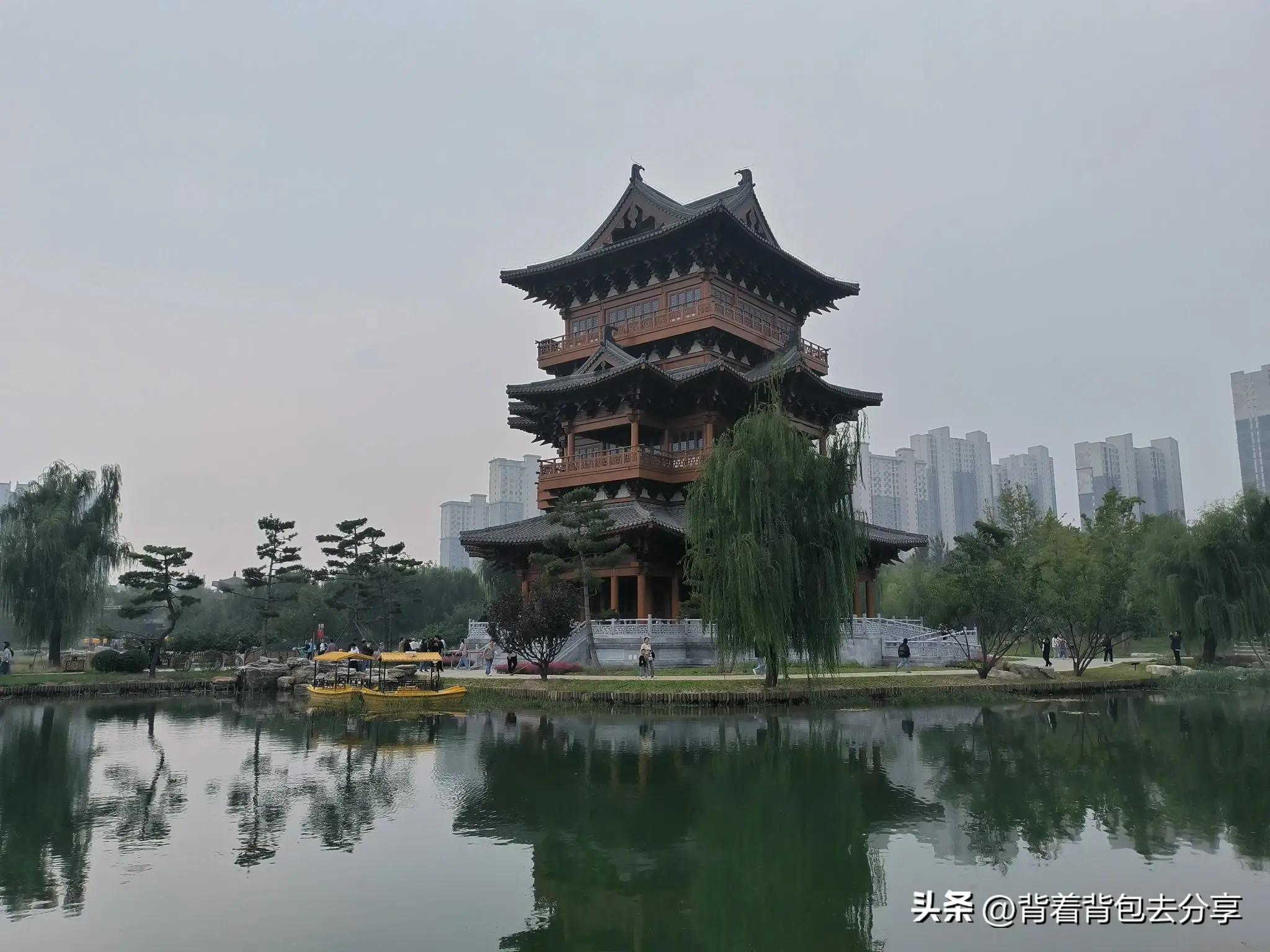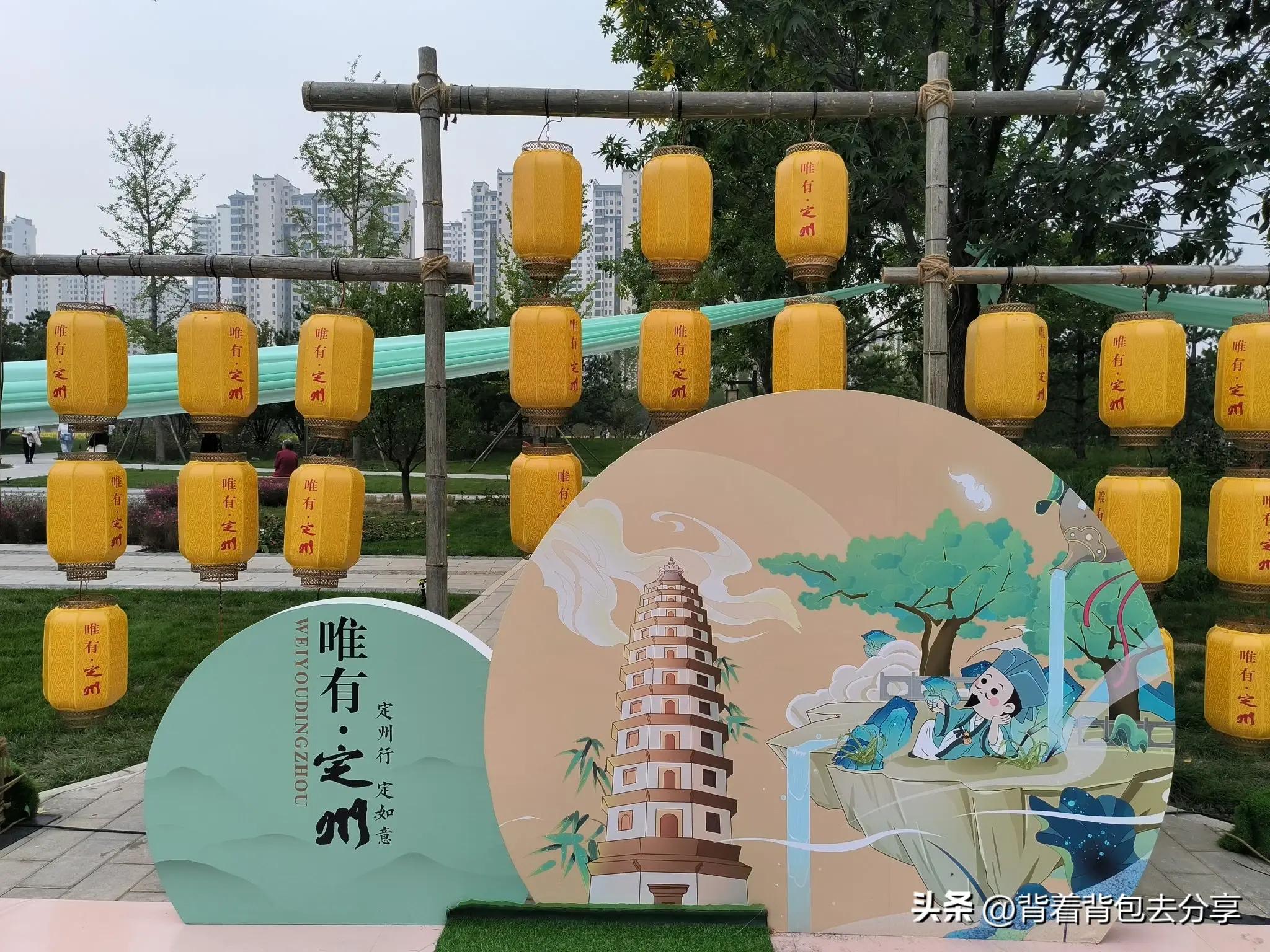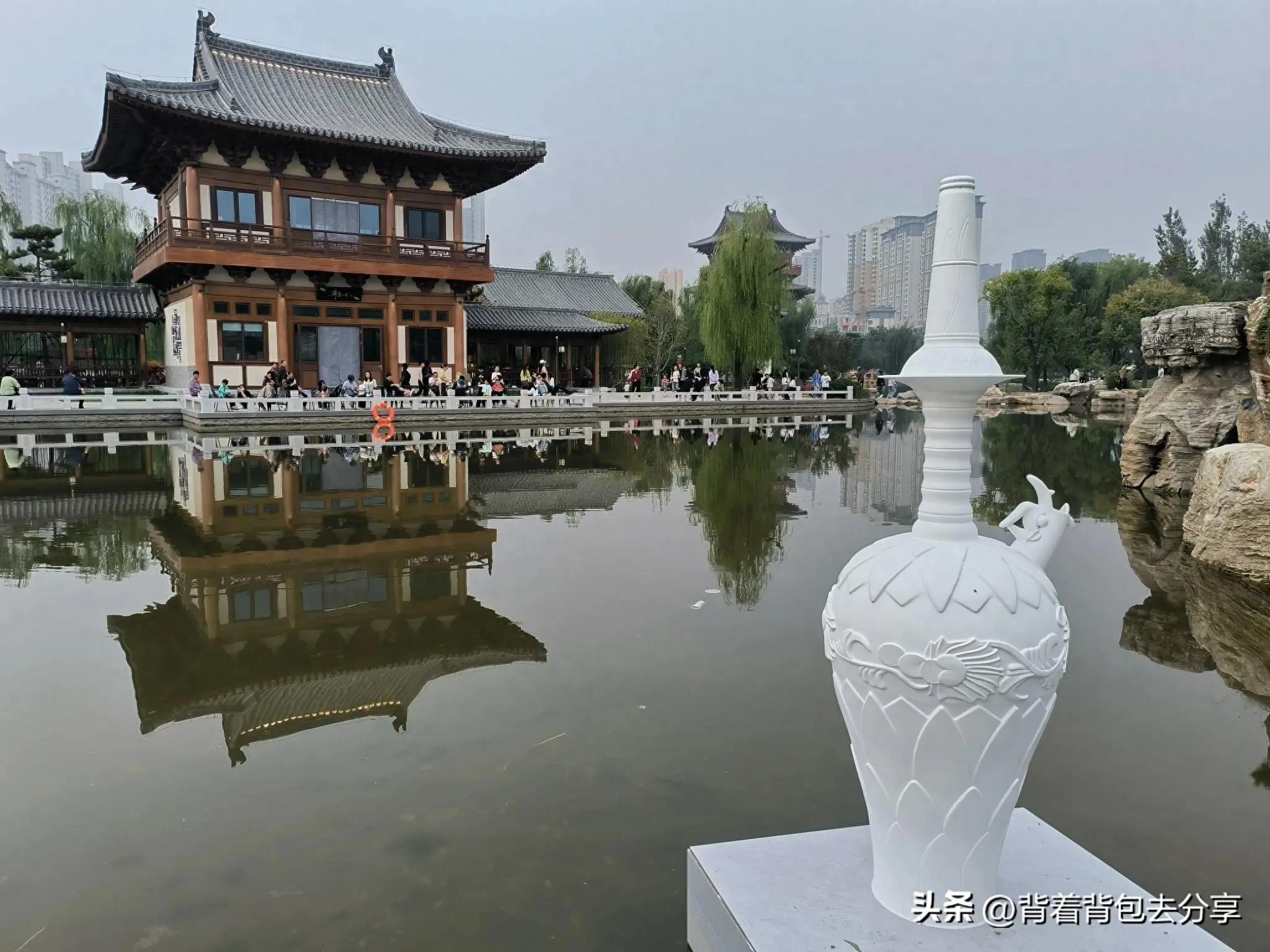 過瞻宸街,來到了百花池的北岸,高大建築倒映在花池之中,看過景區導覽圖,才知是駐春閣,如遇到法定節假日,駐春閣的夜晚非常熱鬧,簡單的拍了幾張照片,隨後,來到了悠然山,山角有定州博物館,三大鎮館之一白釉刻花龍首淨瓶模型,是定窯產品之最,有定瓷之王的美譽,很多的遊客,也是藉此拍照,與清韻軒和駐春閣,形成了三景同一框的景色