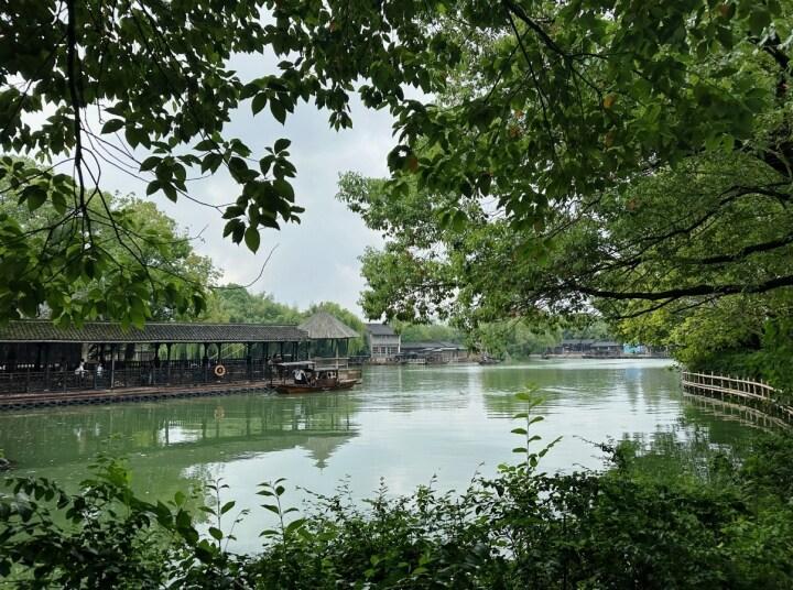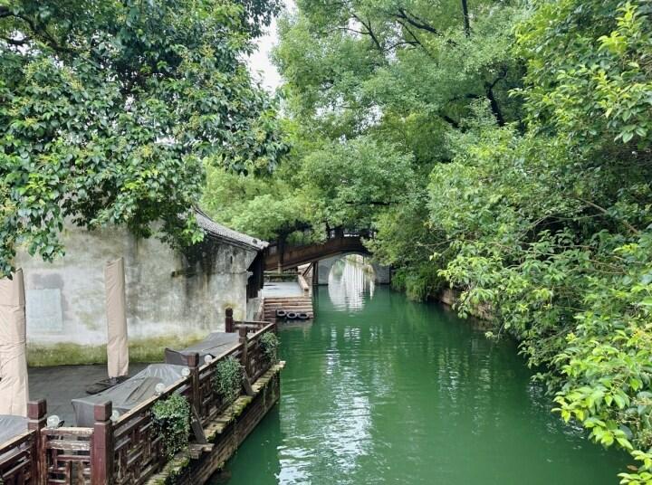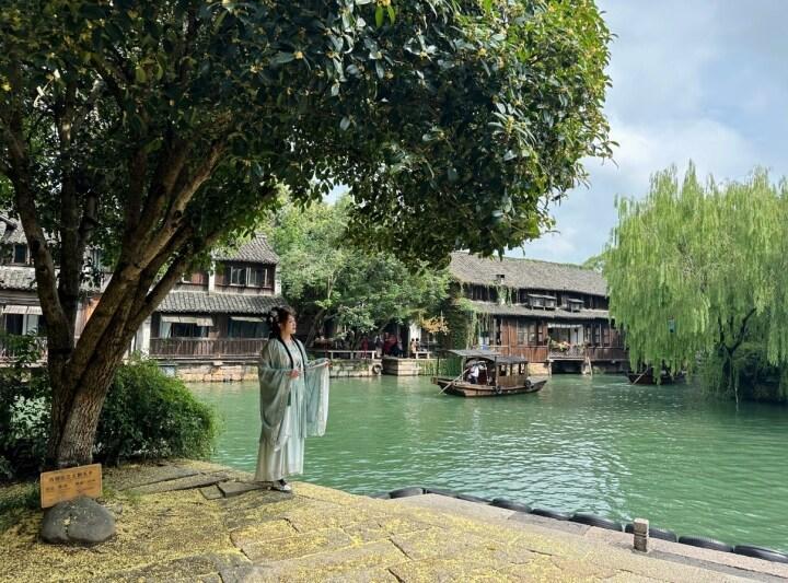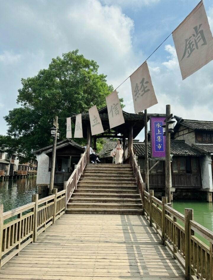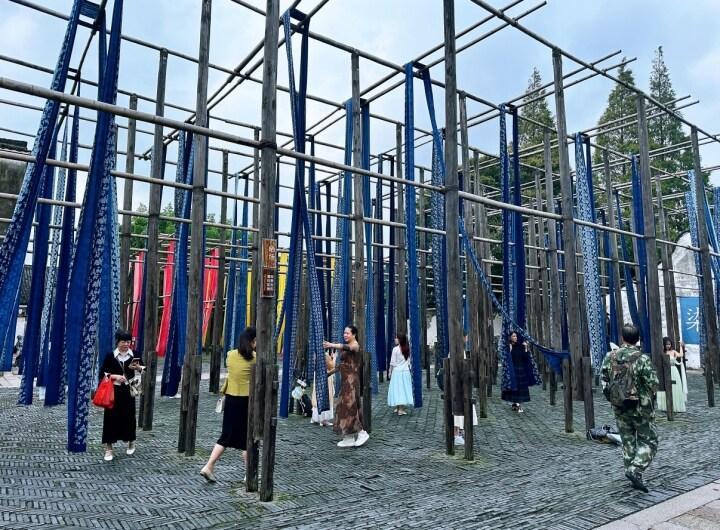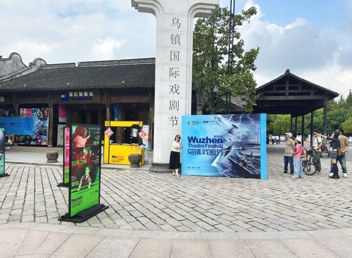 遊客前來參觀2024烏鎮戲劇節並在入口處合影留念 記者 楊朝霞 攝