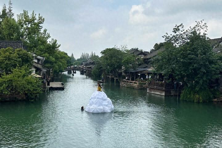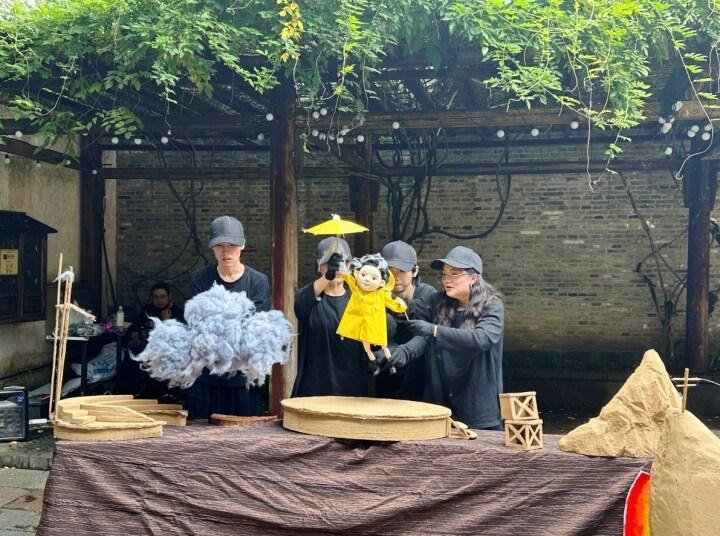 2024烏鎮戲劇節開幕前演員在烏鎮街頭演出偶劇《我的寵物是朵雲》記者 楊朝霞 攝