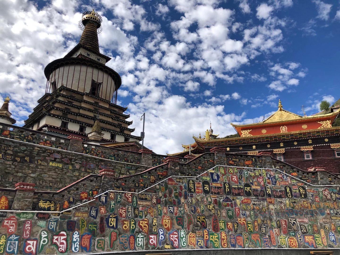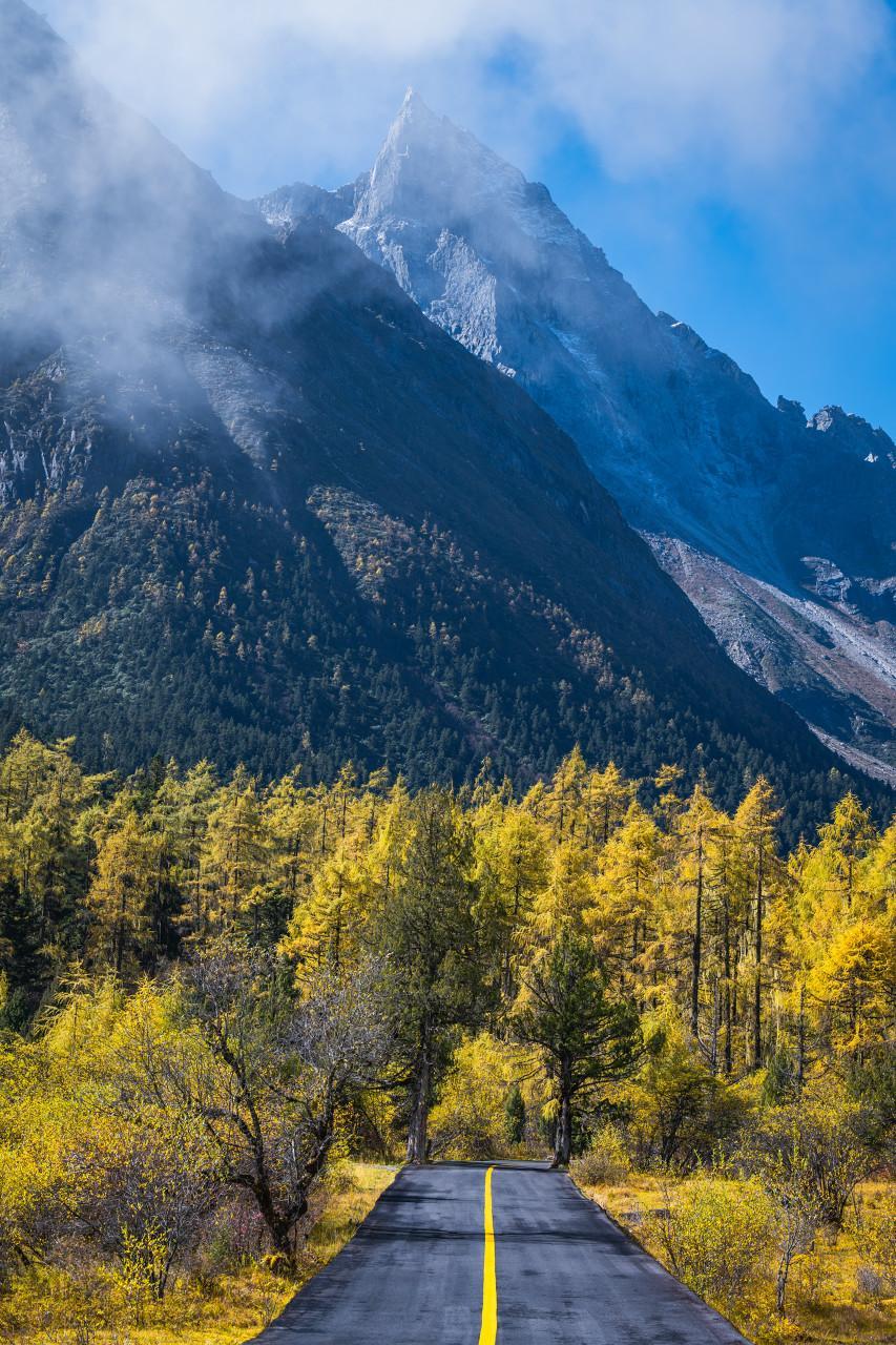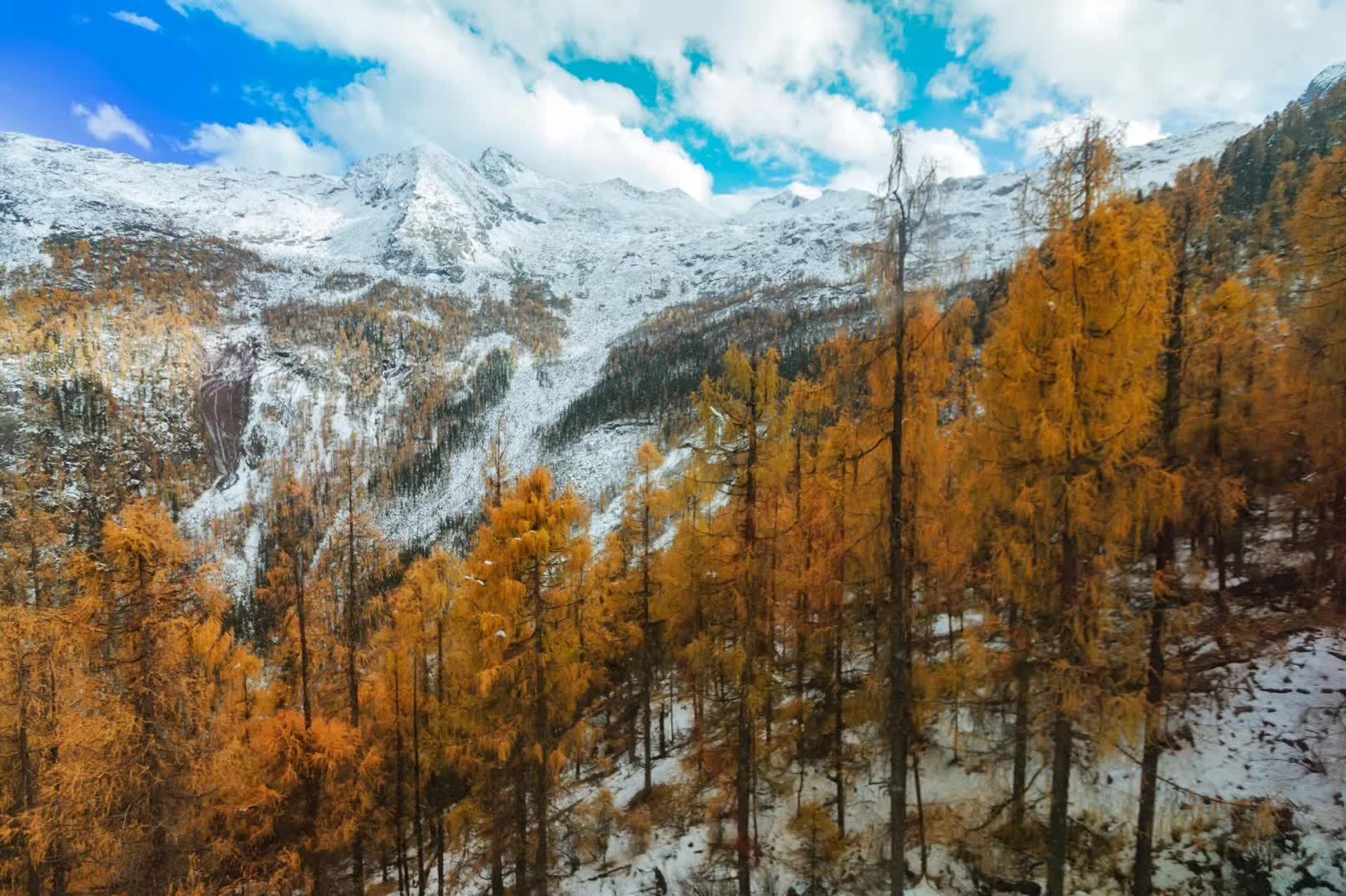 紅葉、金黃、橙色和深紫交織在藍天白雲下