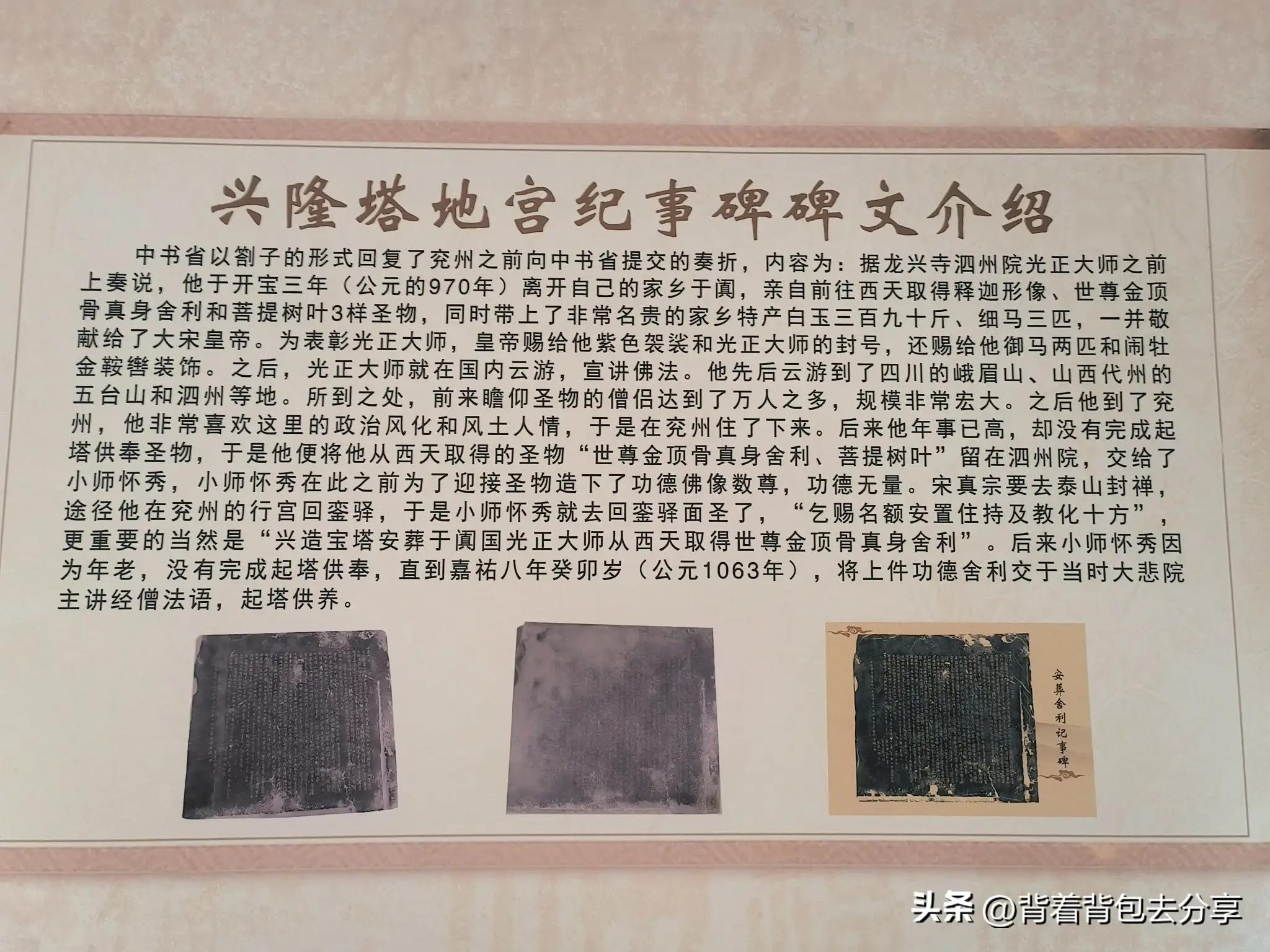 在興隆塔的北面,是興隆塔的地宮,在2008年興隆塔地宮被盜,從西天取得的真身舍利流離失所,地宮被打開後,考古發掘出土一批珍貴文物,安葬舍利紀事碑,上面刻滿銘文通篇32行,910字或許就記載了興隆塔地宮的全部祕密,雖然,地宮被盜,但在興隆文化園內,還原複製了一座原始的興隆塔地宮造型