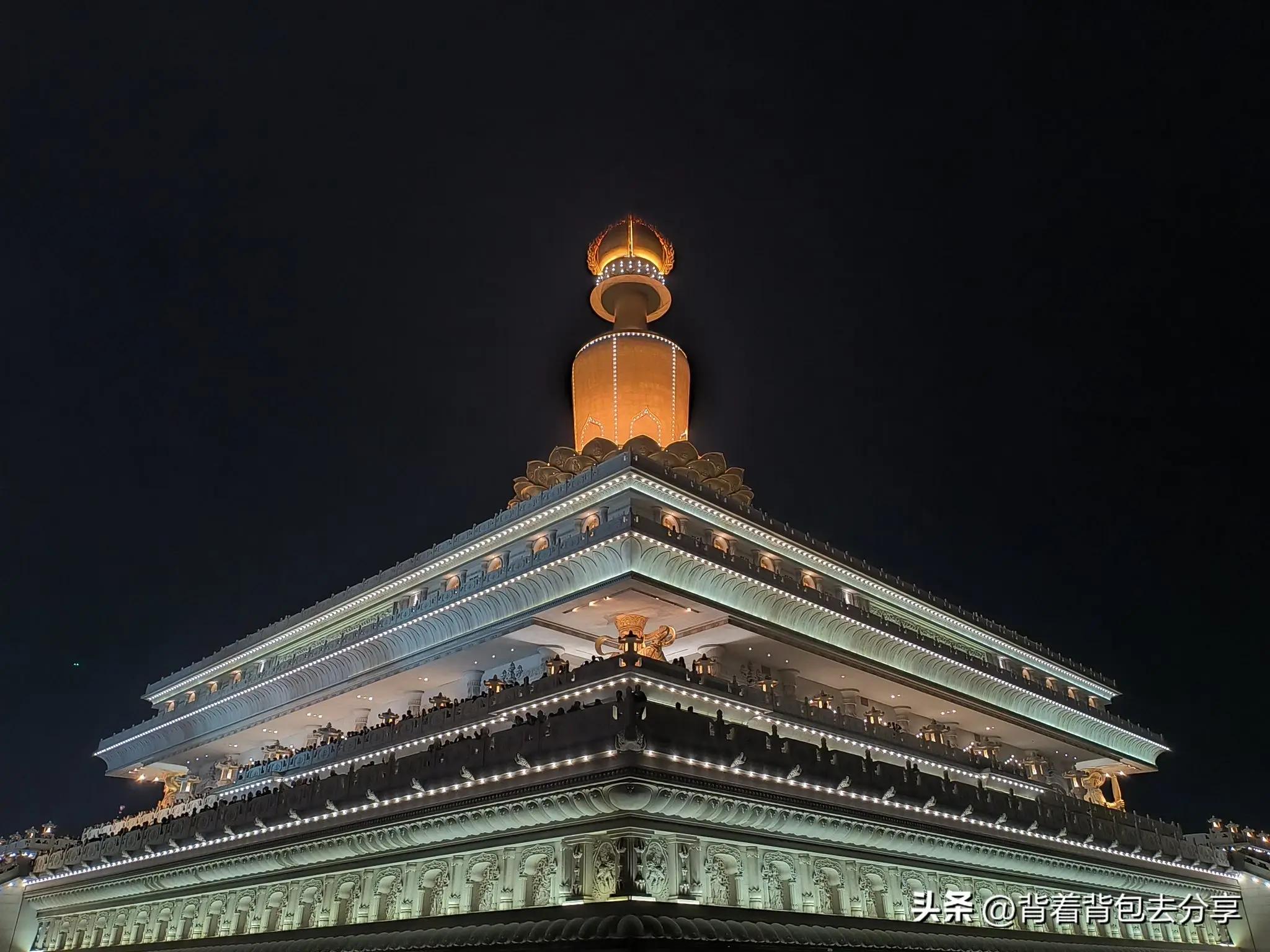 從西側鐘樓上來後,來到了興隆文化園的核心建築是靈光寶殿,按照興隆塔地宮發現的,迄今爲止國內唯一出土的舍利金瓶爲藍本,佛光生輝的恢宏建築,靈光寶殿現只有一樓對外開放,但爲了給遊客更好的體驗,每週的二.四.六.日,都有豐富的表演,如興隆禪鼓.一夢敦煌等