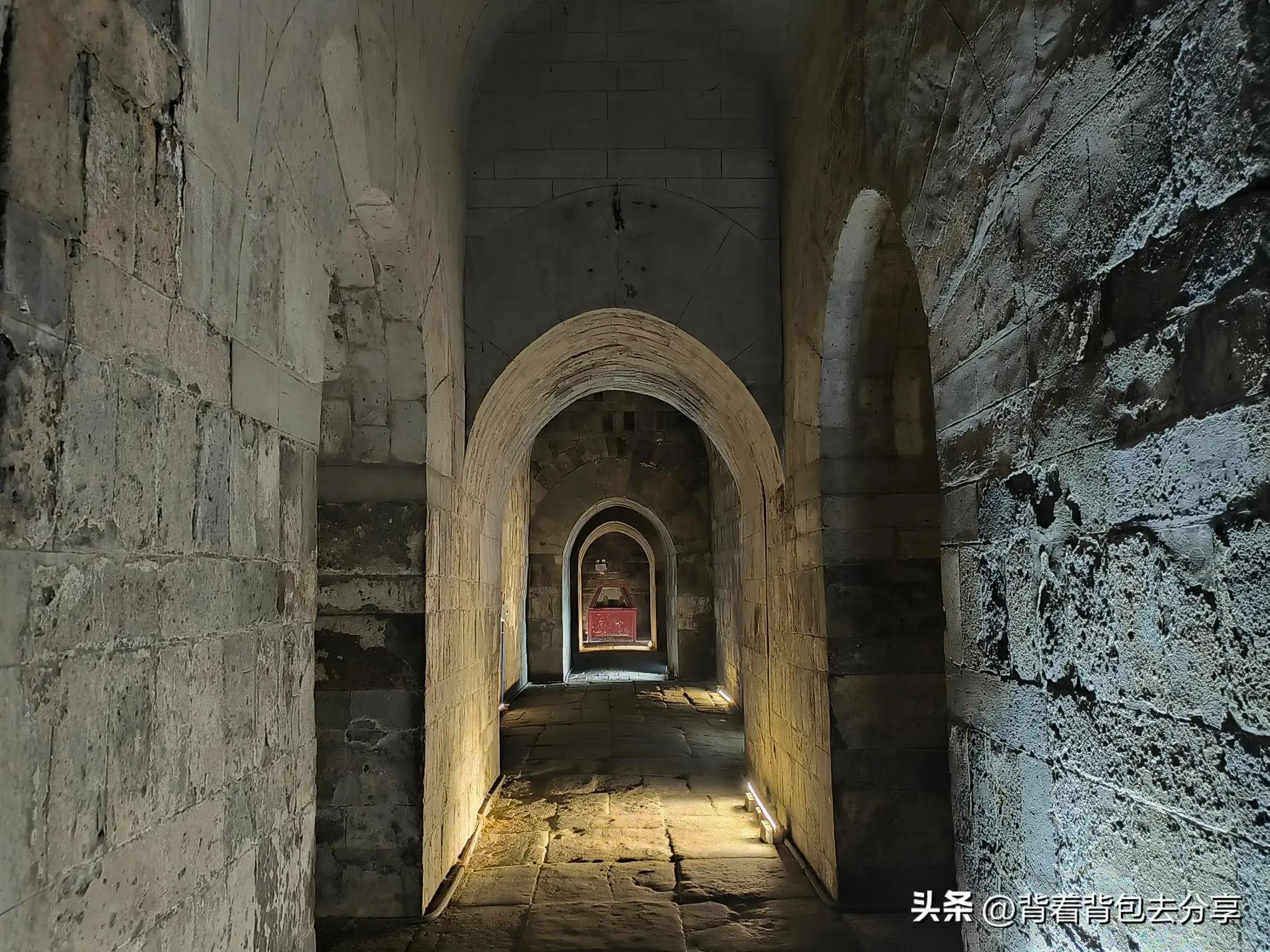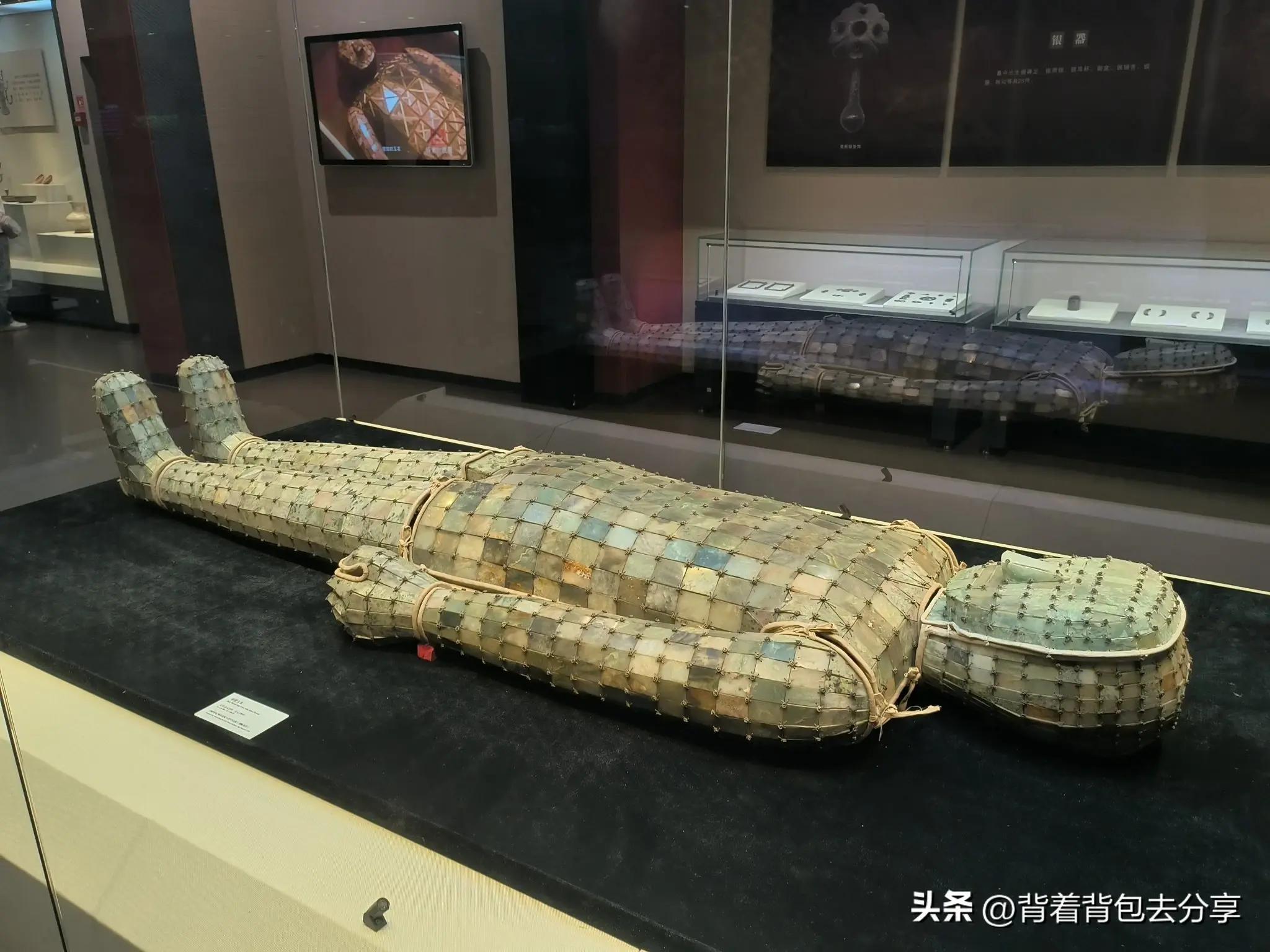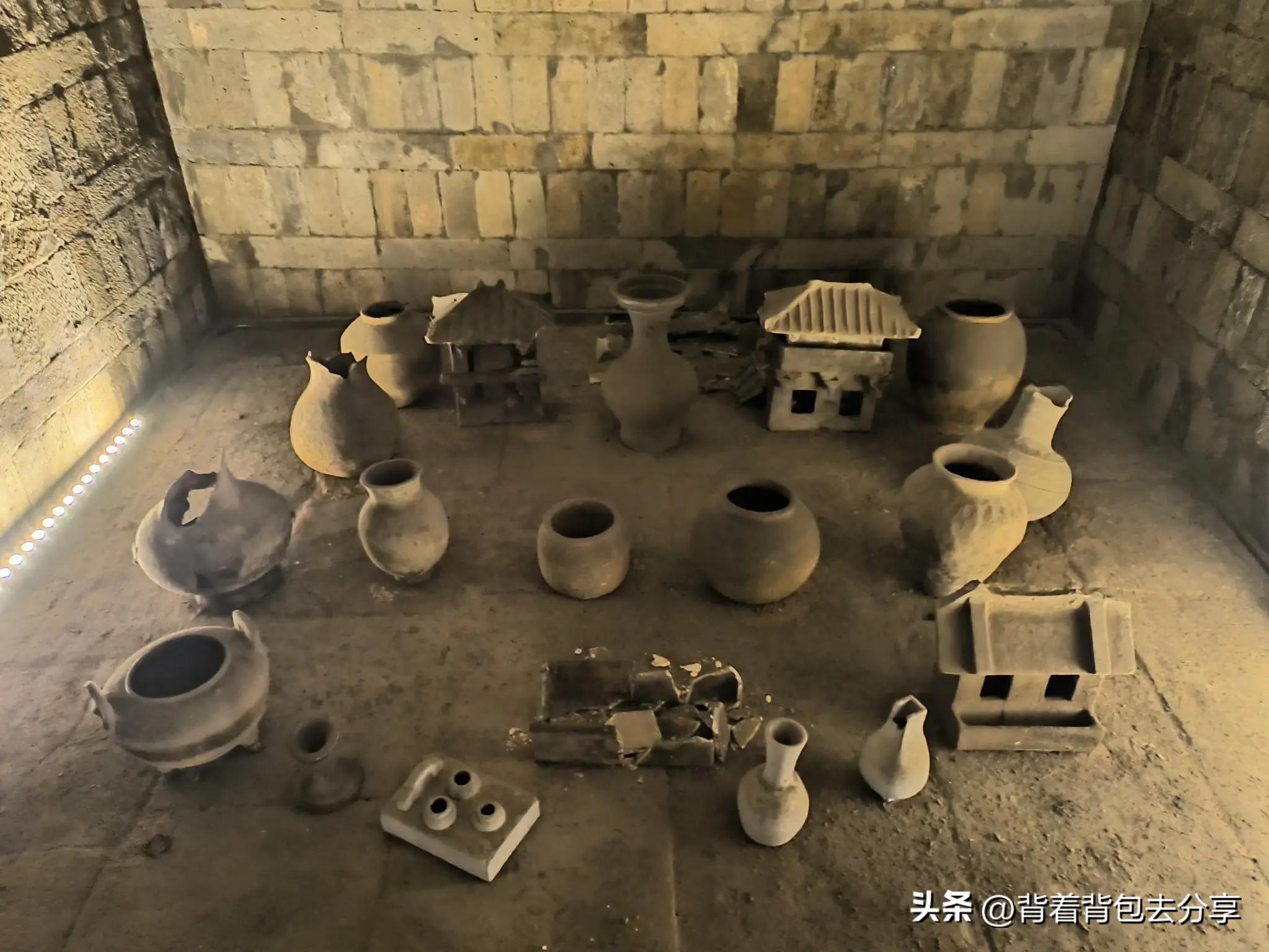 屋內展示的文物,極爲簡單,都是一些中山王墓葬的器物,緊接着沿樓梯下行至地宮,排風扇的聲音很大,墓室卻非常安靜,因爲中午這裏也沒有什麼遊客,隻身一人到地宮,還有些膽怯,地宮下面很小,走到盡頭來回也就2-3分鐘左右,畢竟墓室曾經被盜,現只有金縷玉衣殘片和器物的金飾片,還有一些陶陶罐罐,不知道是複製品,還是文物在此展示