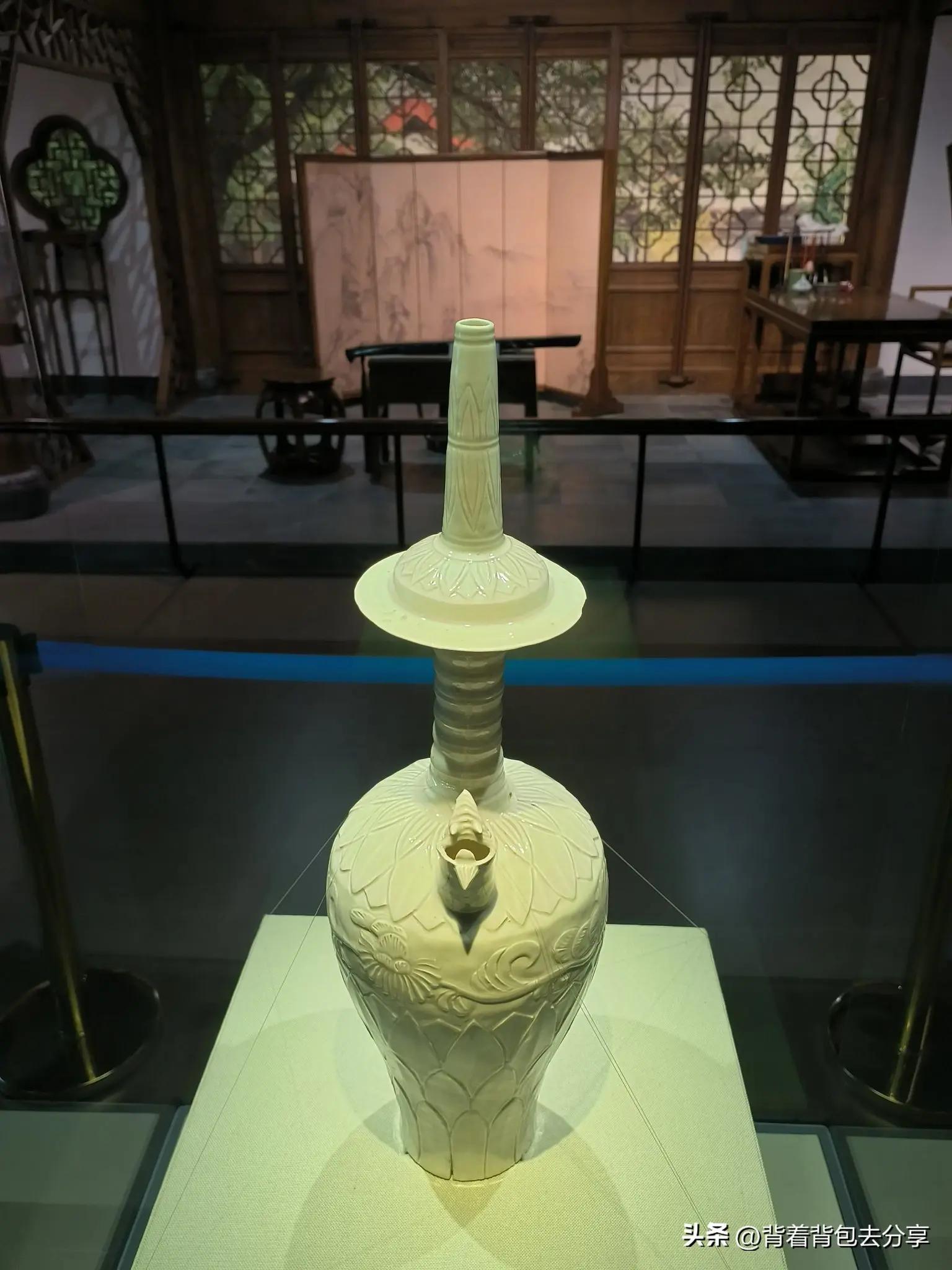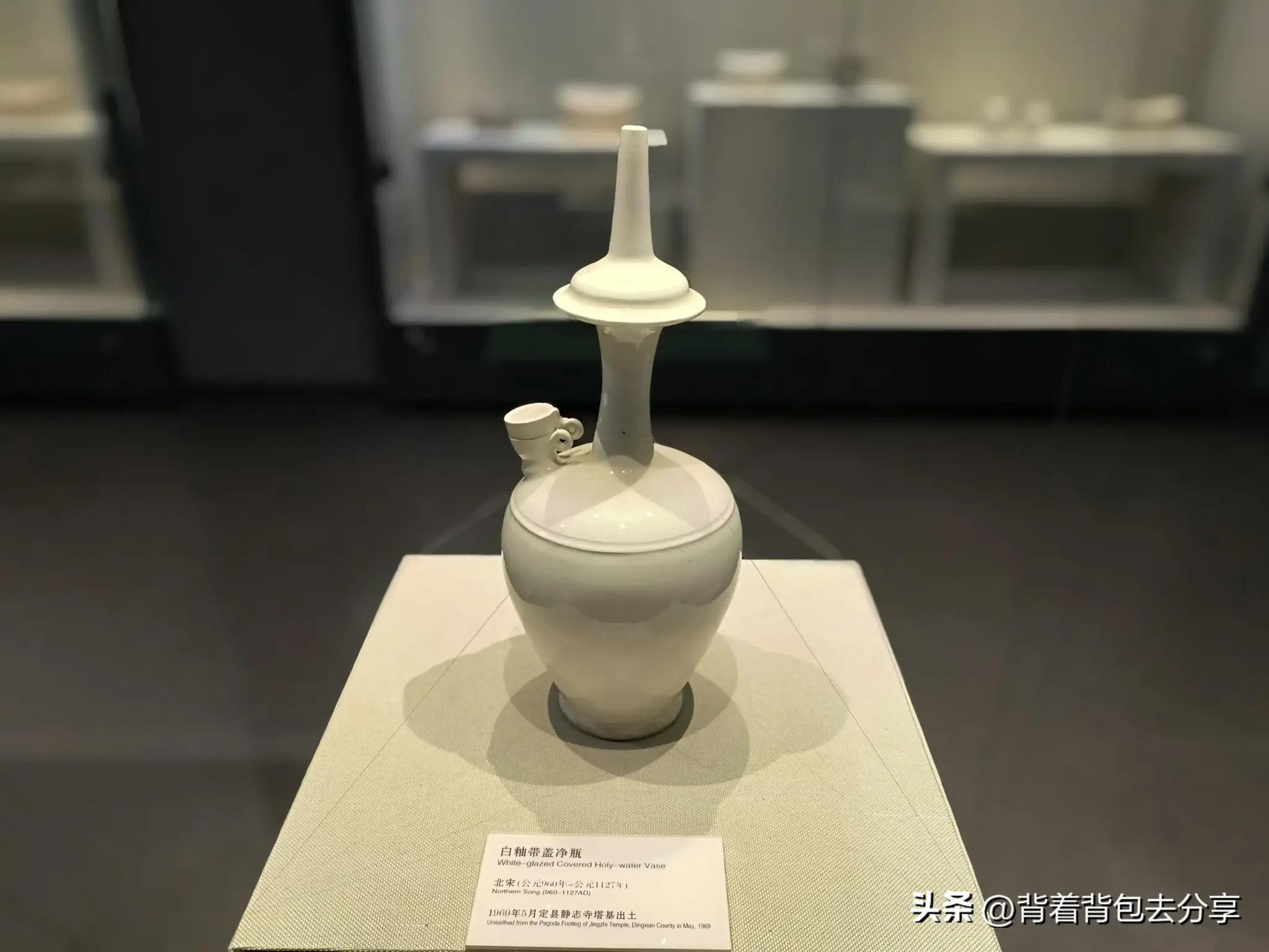 從漢家陵闕出來之後,沿扶梯上行,來到了天下大白展廳,主要是定窯的瓷器,定窯是北宋五大名窯之一,以白如玉,薄如紙,聲如磬爲主要特點,北宋時期定窯製作精湛,瓷質瑩潤,風格古樸高雅,裝飾絢麗,有定州花瓷甌,顏色天下白的美譽,館藏第3件文物就在這所展廳,定窯白釉龍首蓮紋大淨瓶,是定窯瓷器之最,並有着定瓷之王的美譽