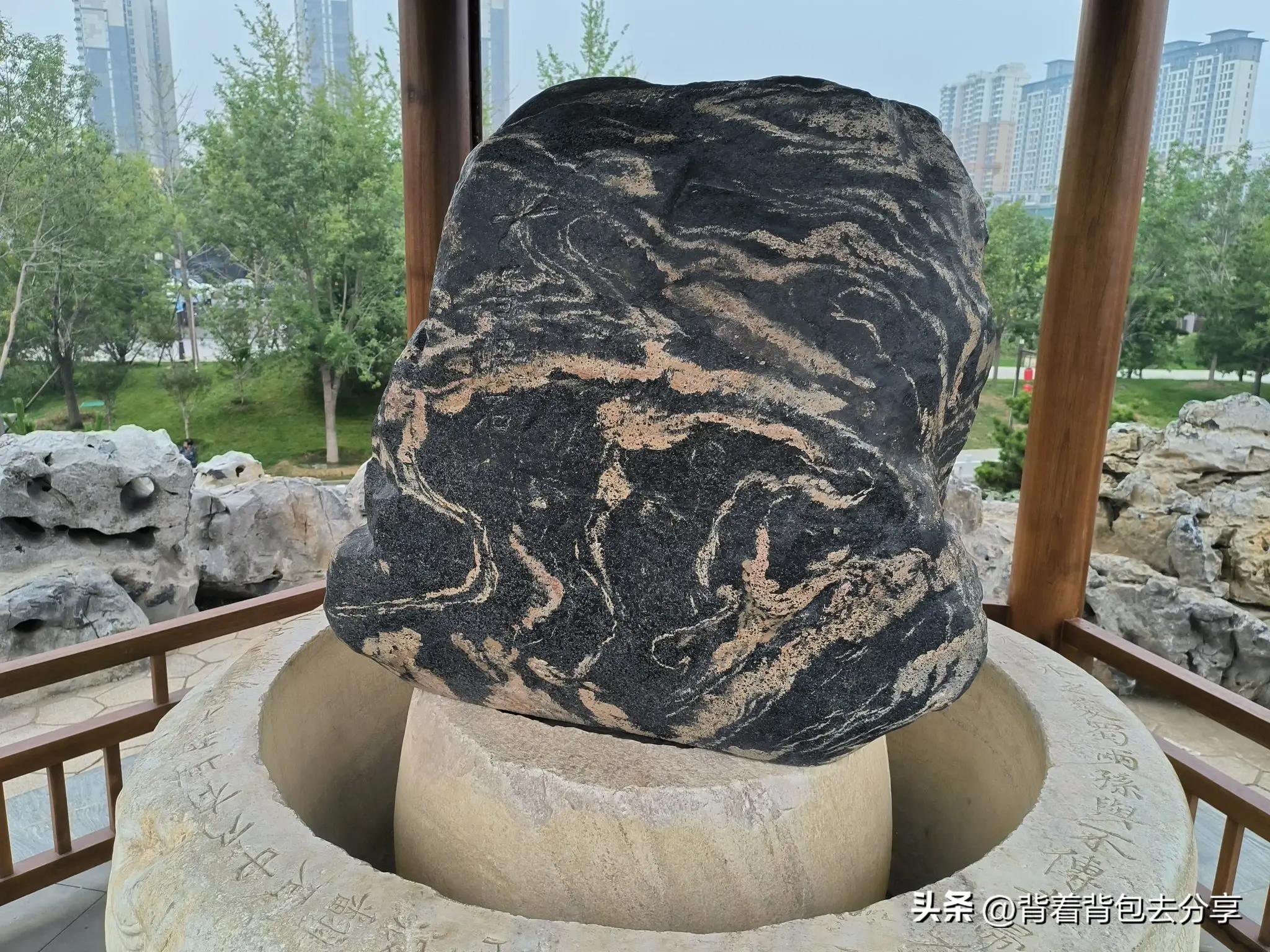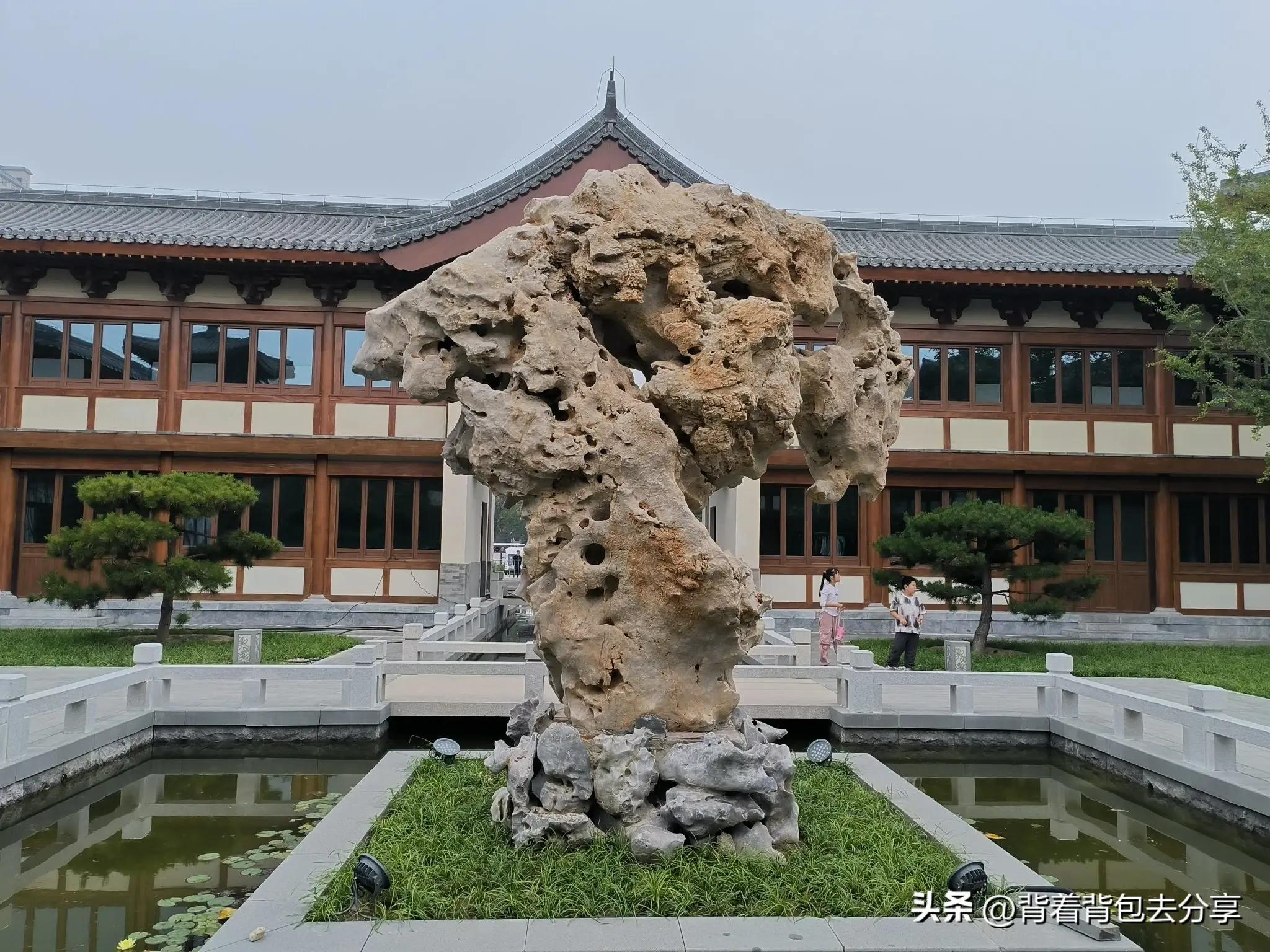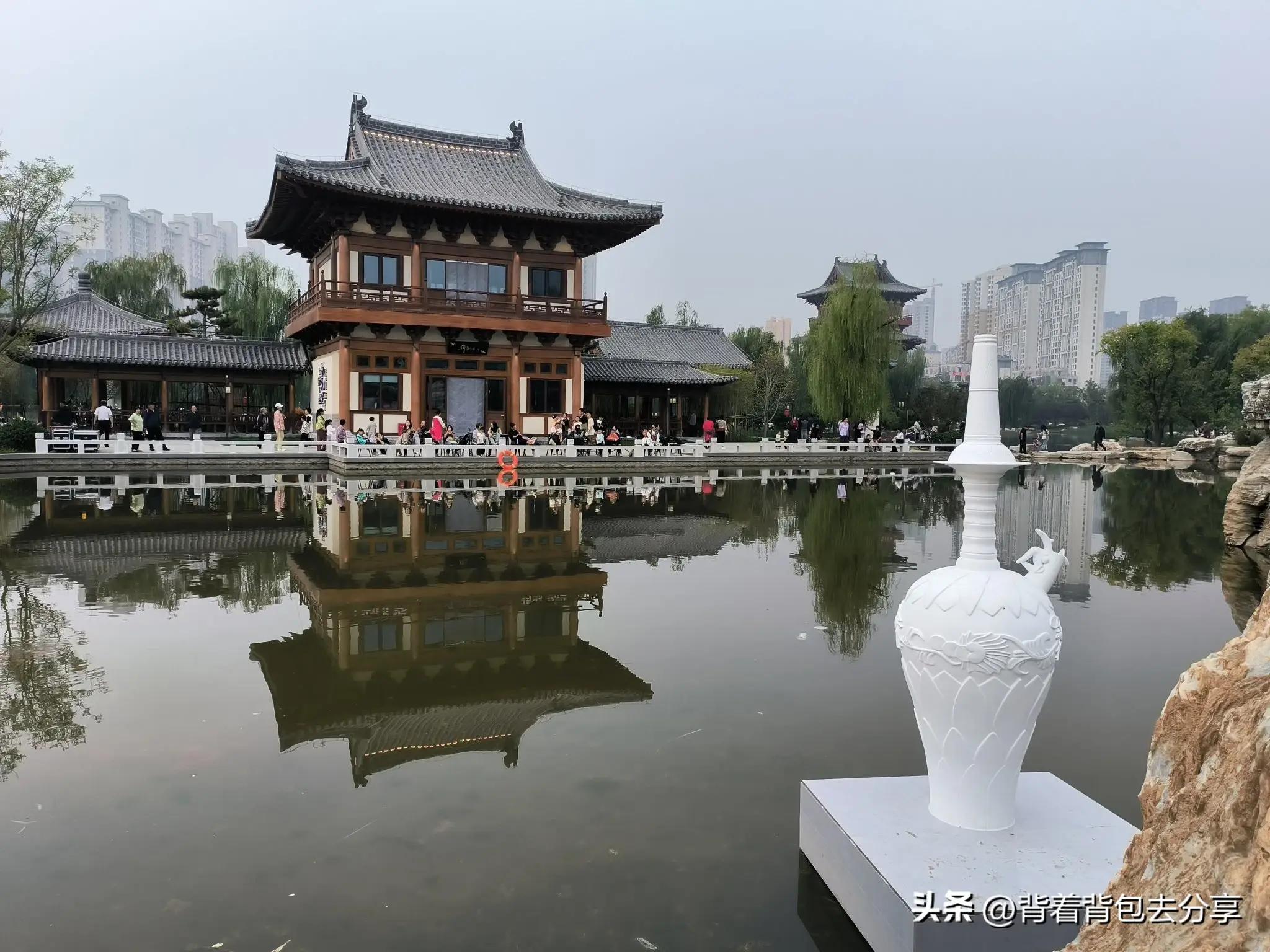 過瞻宸街,來到了百花池的北岸,高大建築倒映在花池之中,看過景區導覽圖,才知是駐春閣,如遇到法定節假日,駐春閣的夜晚非常熱鬧,簡單的拍了幾張照片,隨後,來到了悠然山,山角有定州博物館,三大鎮館之一白釉刻花龍首淨瓶模型,是定窯產品之最,有定瓷之王的美譽,很多的遊客,也是藉此拍照,與清韻軒和駐春閣,形成了三景同一框的景色