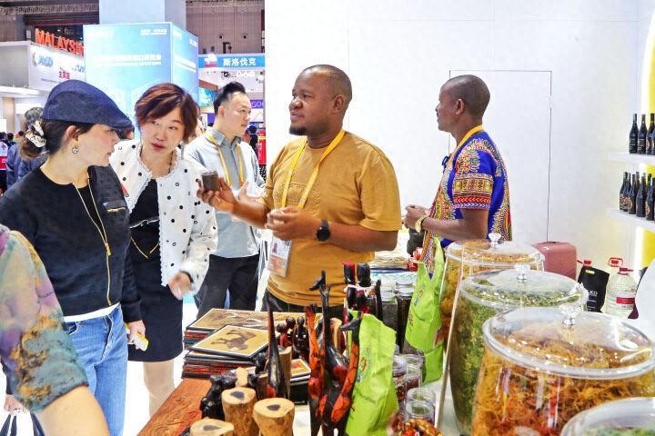 圖爲11月6日,觀衆在第七屆進博會坦桑尼亞國家館展區參觀選購。 記者 陳晨 攝