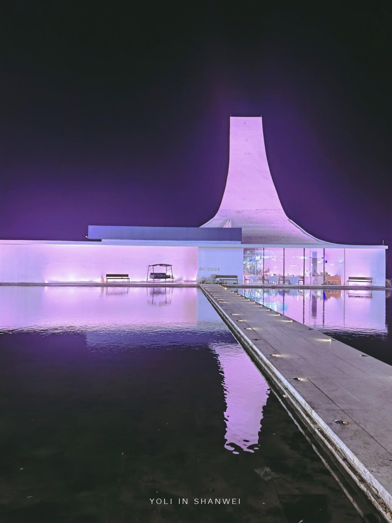 金町灣。汕尾人眼裏的“濟州島”,世界級的濱海度假區,沙灘️細膩柔軟,海水乾淨蔚藍,彷彿加了濾鏡一般,被稱爲廣東的小''阿那亞'',這裏的風帆禮堂隨便一拍就是大片,夜晚粉紫色的的風帆禮堂更是夢幻十足,推薦住附近的酒店,既有環境又有風景。