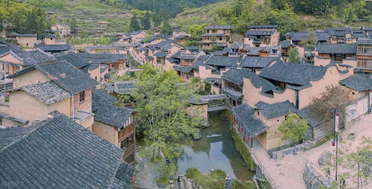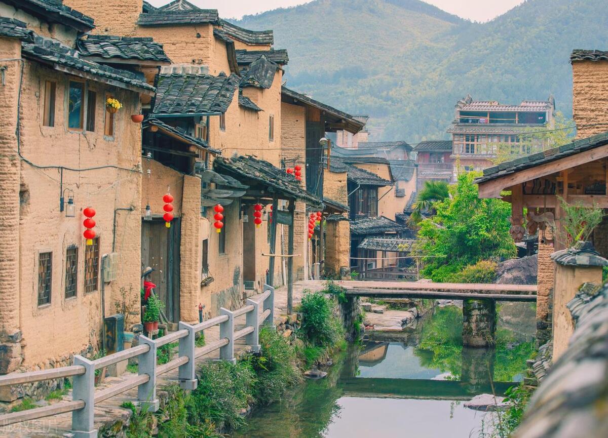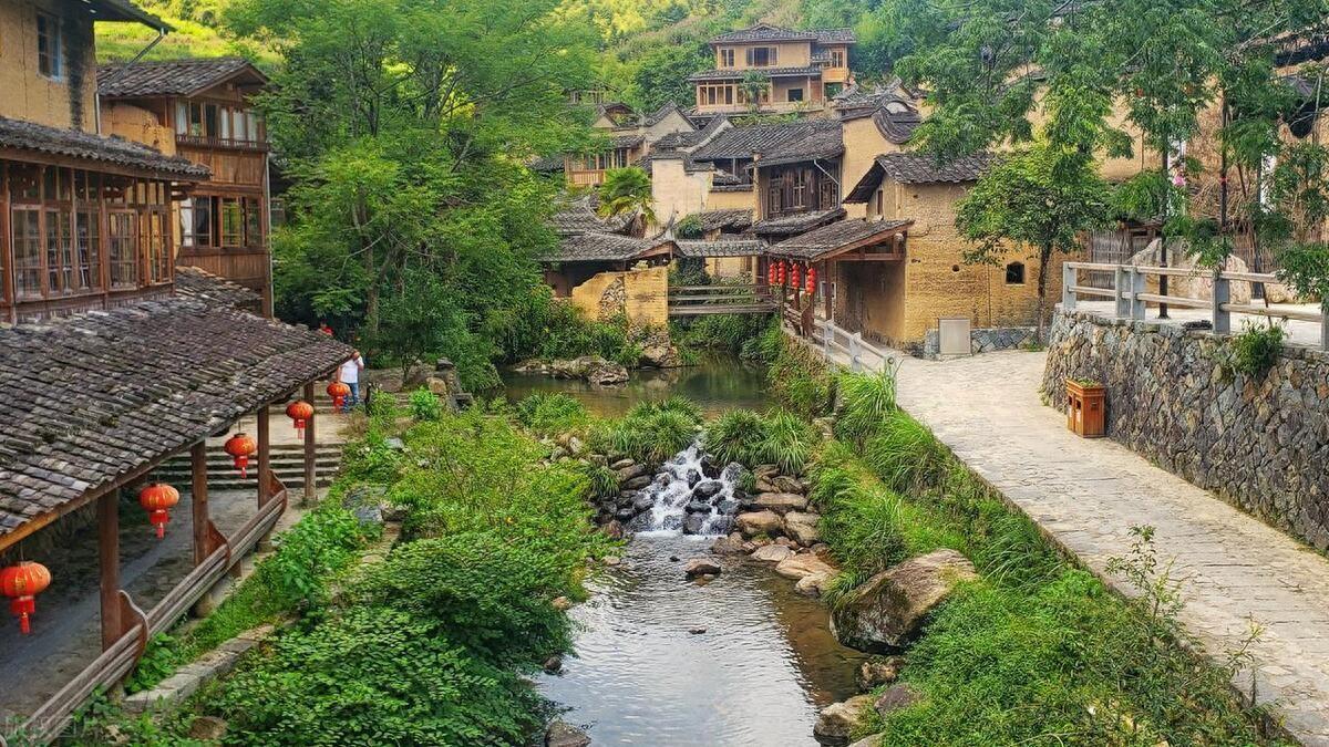 在這裏,時間是最細膩的雕刻家。它以無聲的筆觸,刻畫出歲月的肌理。村子不大,西溪穿村而過,夯土實木的雙層民居沿溪而立。這些古厝大多建於明清時期,黃泥牆斑駁,黑瓦片厚重。最妙的是彎曲的屋檐,線條如山巒般高低起伏。兩側飛檐猶如鳥兒展翅,伸向羣山的懷抱。