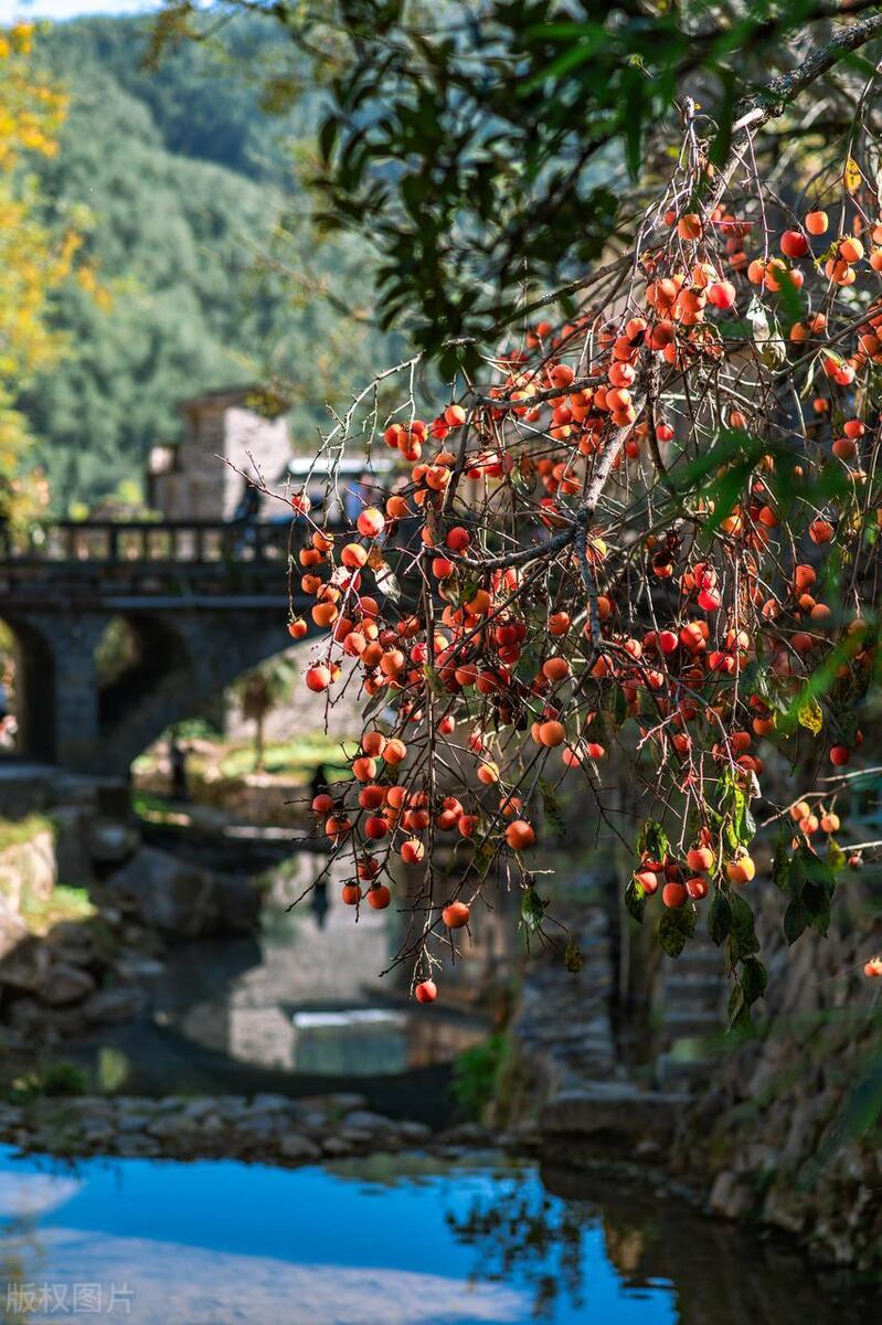 大自然是世間最優秀的調色師。遠山的灰綠與蒼穹的碧藍交織盤結,宛如淡色水墨畫,懸於古村之上。近處的葳蕤又悄然摻入霜白、黃褐與酡紅。沉澱兩季的綠意略顯頹老,卻將昔日盛放的生機浸透在碧水間。小溪潺潺,自岩石上輕盈跌落,攜帶着滿坑滿谷的翠綠記憶,匯成一曲明快的小令,注入遠山悠長的韻腳。溪邊的柿子樹上,綴滿紅彤彤的果實,是大自然的硃砂點綴,烈烈朝暉般,點燃古村的活力與生機。秋山如妝,明淨絢麗。