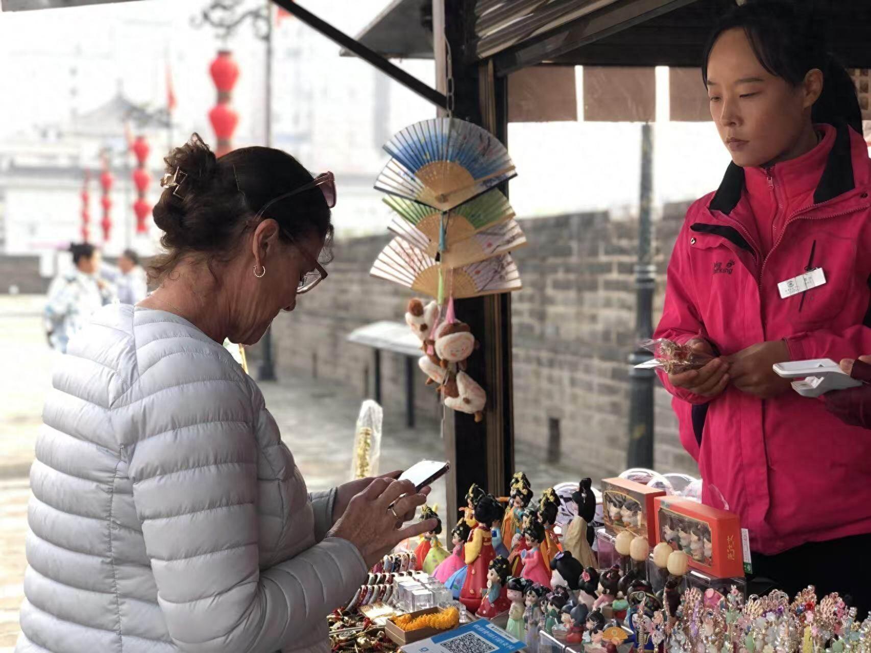 新西蘭旅行商在城牆景區使用手機進行便捷支付 本報記者 任麗 攝