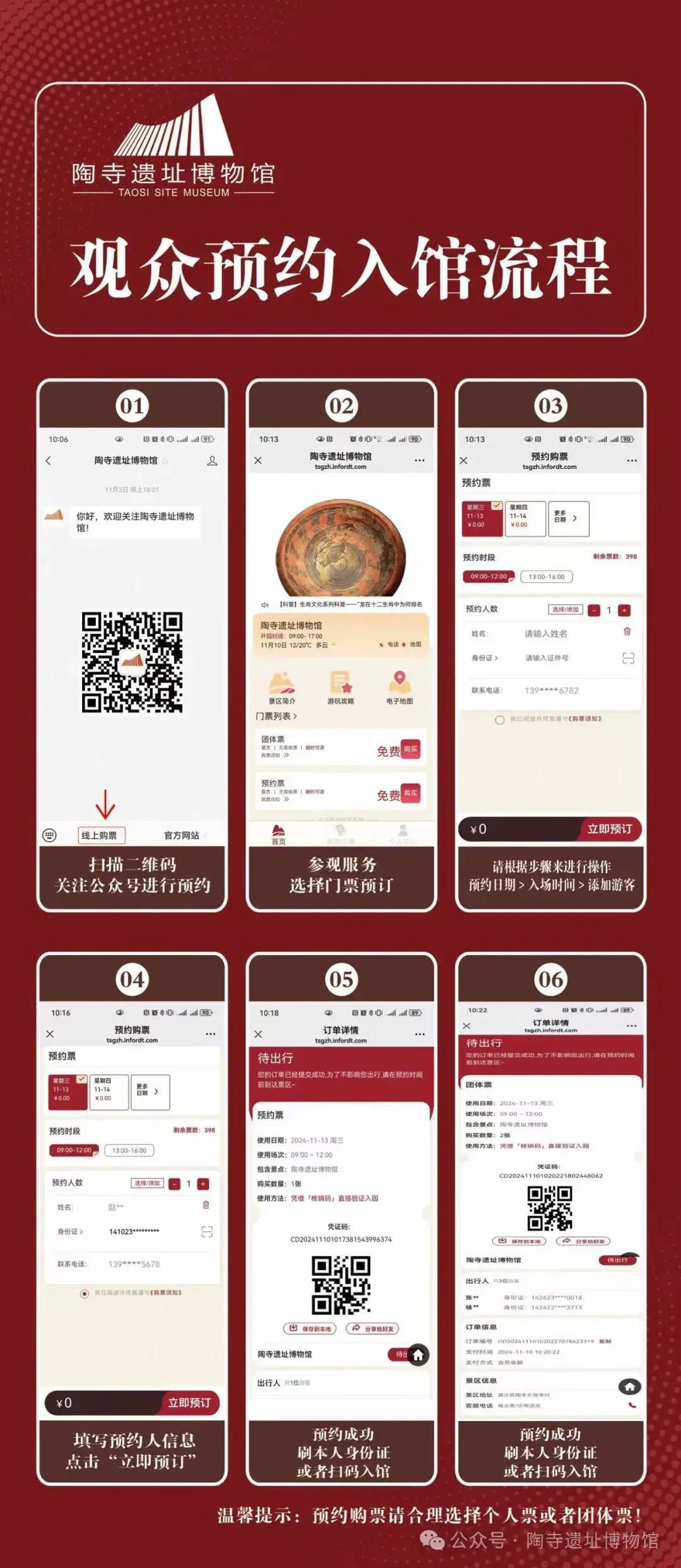 陶寺遺址博物館開通網上預約窗口服務平臺,以滿足更多遊客需求。門票預約提供個人預約和團體預約兩種方式,均採用實名制。個人預約門票可通過官方網站或微信公衆號進行線上預約。預約成功後憑二維碼或本人身份證,作爲入館檢票憑證。團體預約時,須提供統一社會信用代碼。