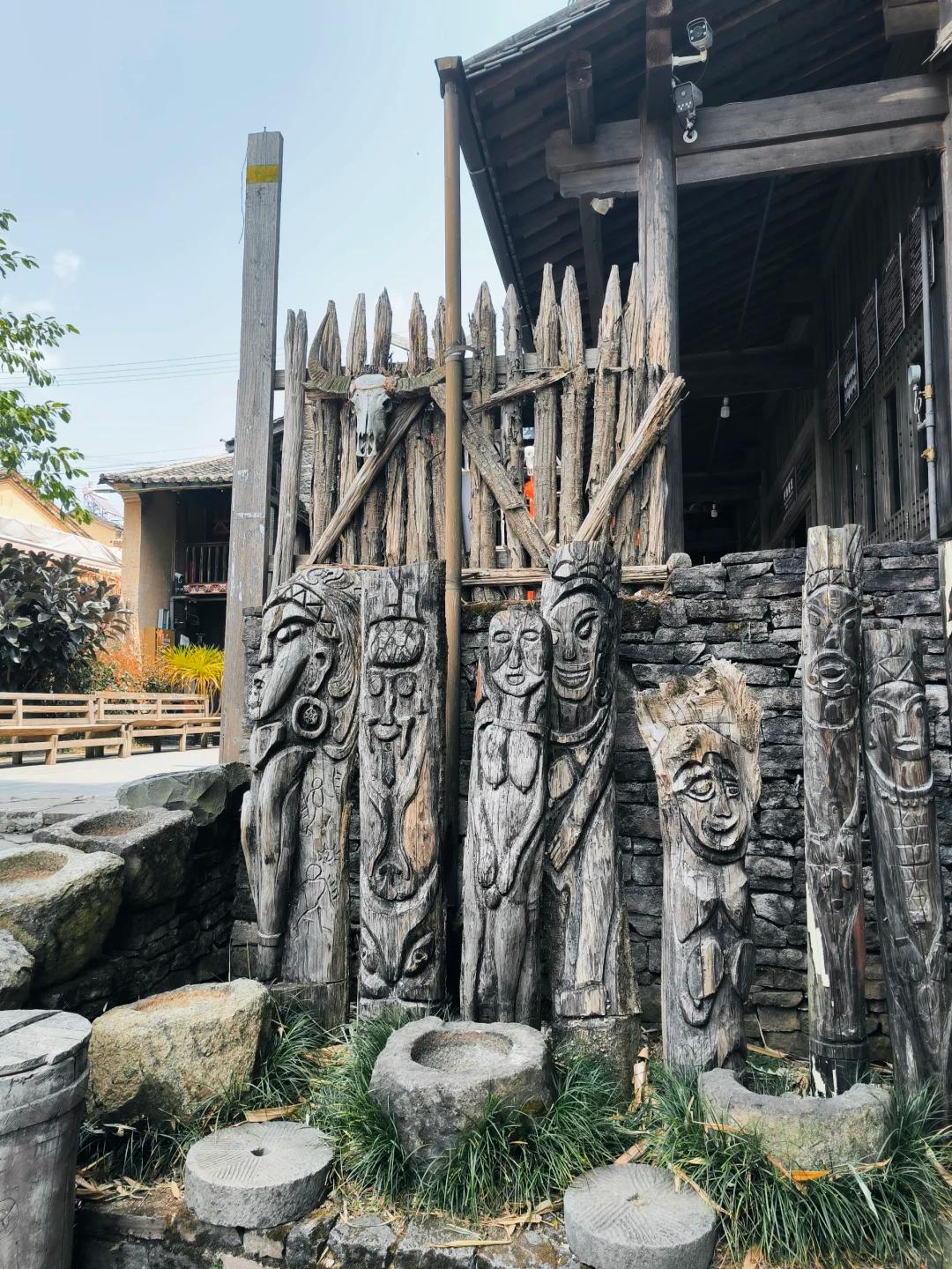 村寨的民居風格,是黃牆黑瓦木門的傳統組合,隨處可見裝飾的木雕以及花紋圖案,大多是充滿了佤族風情的歌舞元素和牛頭造型。