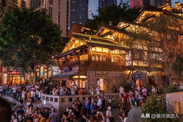 首先就是洪崖洞,感覺來重慶旅遊,不去洪崖洞就相當於是白來重慶了,在很多人的印象中去重慶就必須到洪崖洞。所以洪崖洞也成了重慶旅遊的一張名片,來這裏的遊客那真的是絡繹不絕,不管是白天還是晚上,各有不同的玩法。白天來這裏的遊客主要是到洪崖洞裏面去逛,裏面有美食,還有商品看的讓人眼花繚亂,逛累了,還可以坐下來品嚐美食,真的是一個非常棒的地方。一到晚上,這裏更加熱鬧,尤其是在洪崖洞馬路對面,或者是在旁邊的千廝門大橋上,遊客的數量更是數不過來。因爲在晚上的時候,洪崖洞的外面會開燈,在燈光的映襯下,顯得格外的美,再加上嘉陵江兩岸的城市夜景,那真的是美不勝收,所以很多遊客都會選擇在晚上過來這裏打卡洪崖洞。尤其是節假日的時候,想找個好的位置拍照,可能都要好久時間去排隊,而且現場人擠人的情況是很常見的。100多米的路可能要走上十幾分鍾,這並不是很誇張,因爲人實在是太多了,也足以說明洪崖洞深受遊客的喜愛。