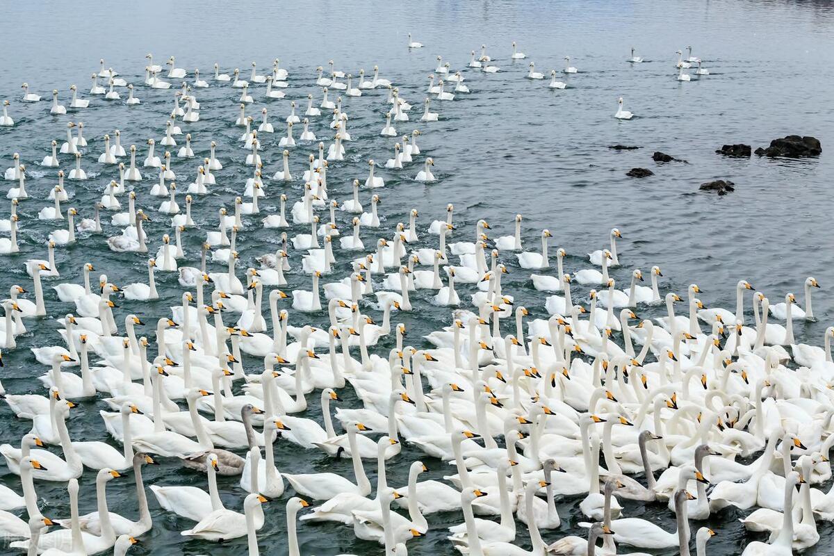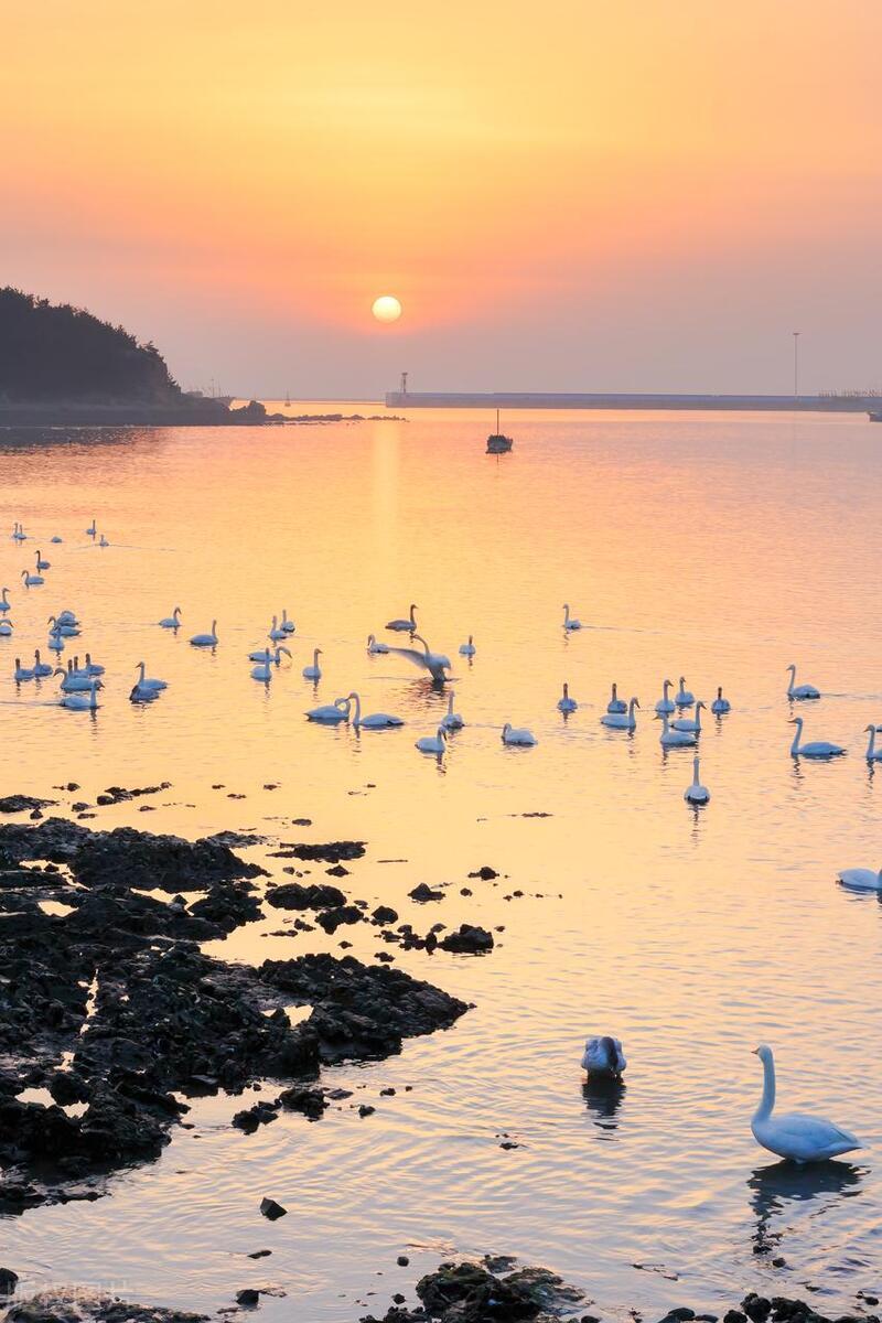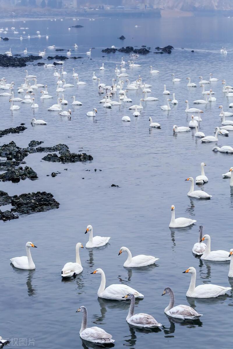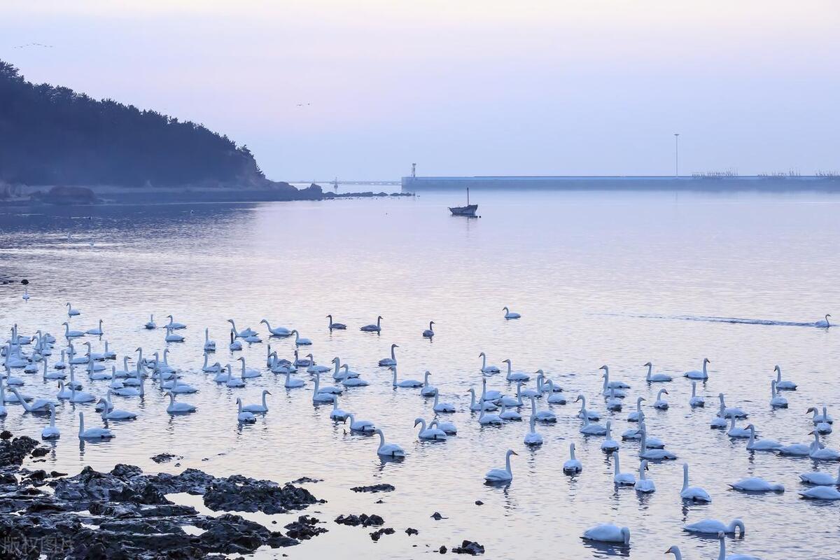 進入11月,越冬的大天鵝成羣集結在山東省榮成市俚島鎮煙墩角村,來自全國各地的遊客架起“長槍短炮”定格天鵝的優雅風姿,宛如“天人合一”的水墨畫卷。