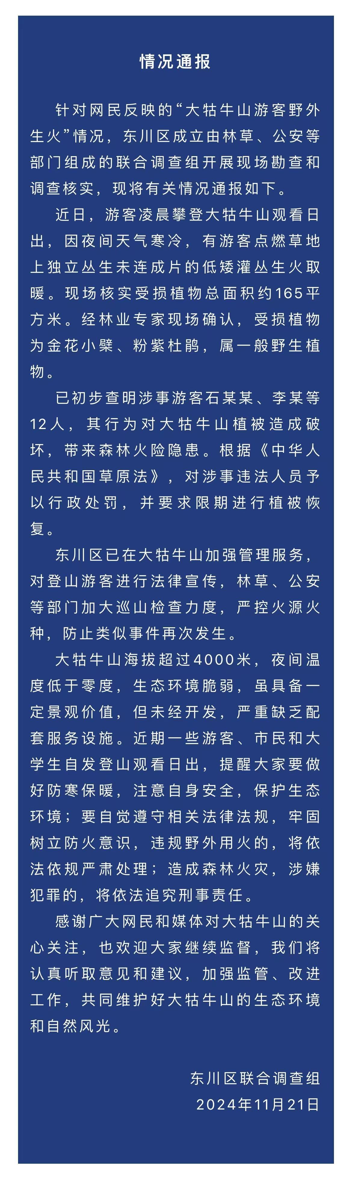 11月21日晚,雲南省昆明市東川區聯合調查組針對網民反映的“大牯牛山遊客野外生火”發佈情況通報: