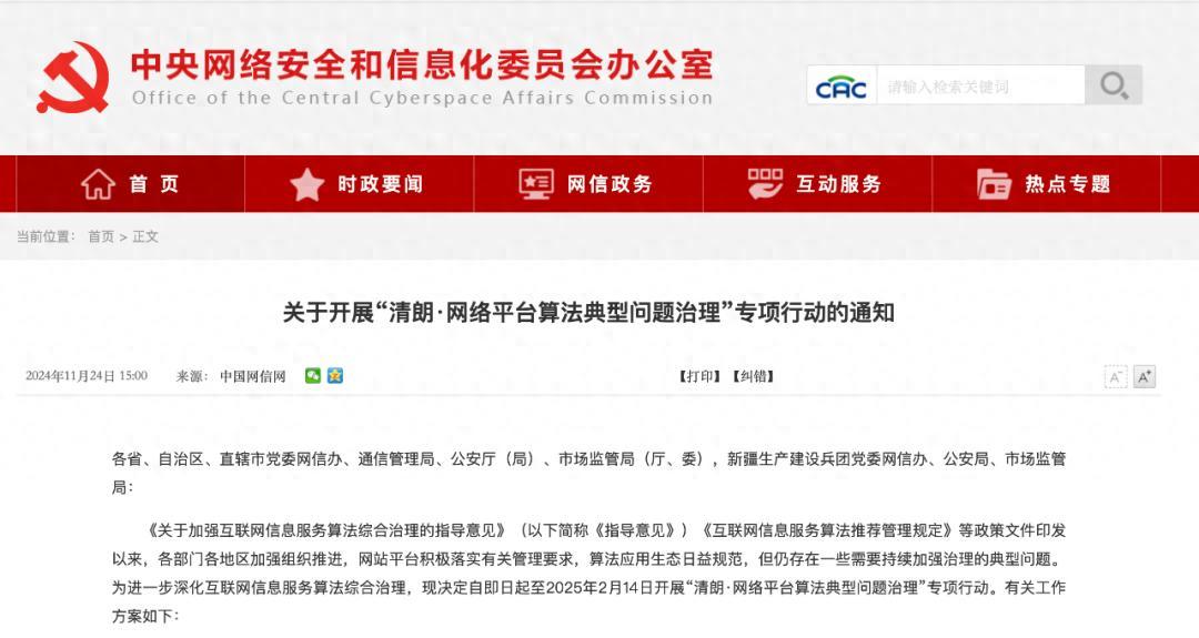 《關於加強互聯網信息服務算法綜合治理的指導意見》(以下簡稱《指導意見》)《互聯網信息服務算法推薦管理規定》等政策文件印發以來,各部門各地區加強組織推進,網站平臺積極落實有關管理要求,算法應用生態日益規範,但仍存在一些需要持續加強治理的典型問題。爲進一步深化互聯網信息服務算法綜合治理,現決定自即日起至2025年2月14日開展“清朗·網絡平臺算法典型問題治理”專項行動。有關工作方案如下: