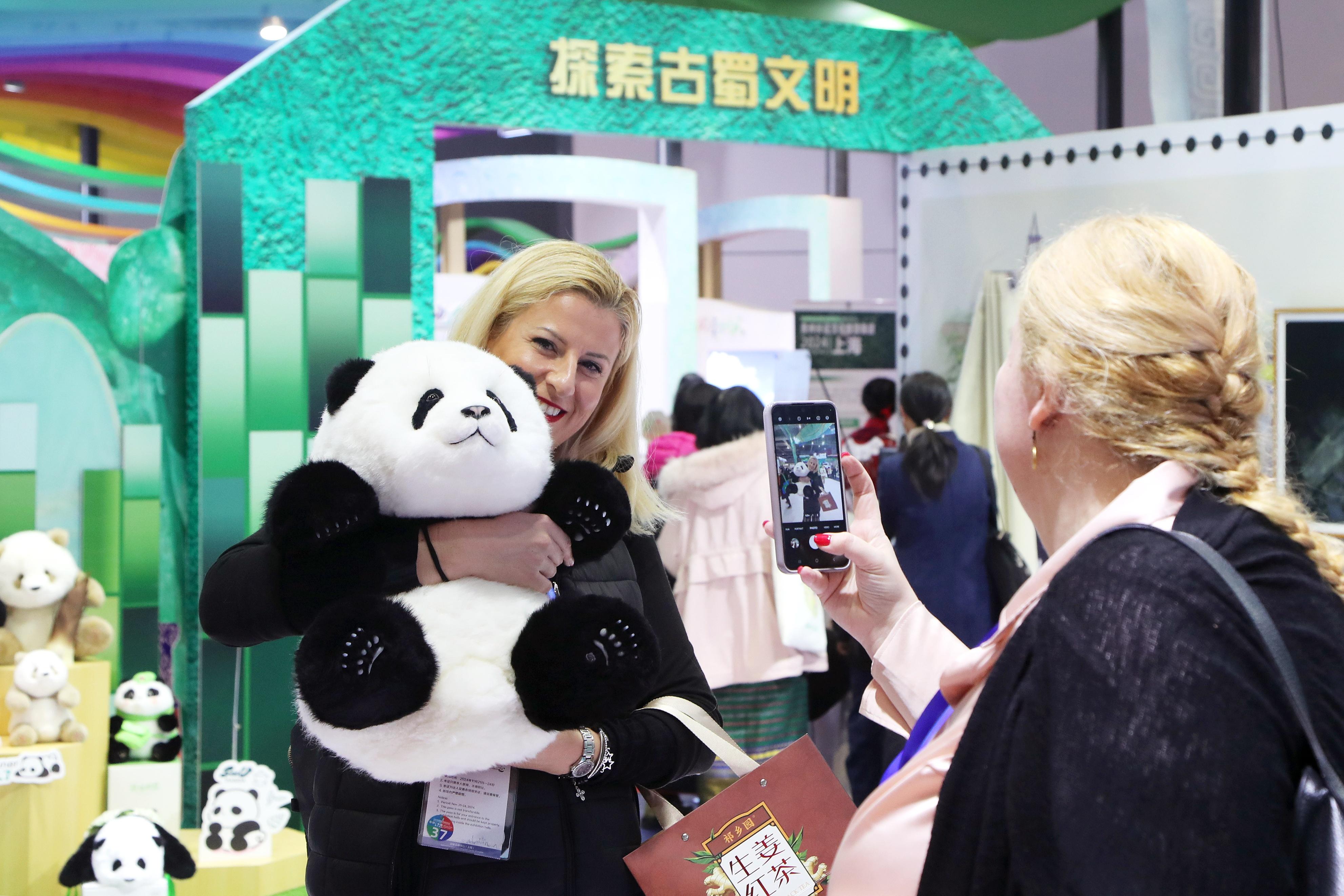 國外展商在四川展臺與熊貓玩偶合影