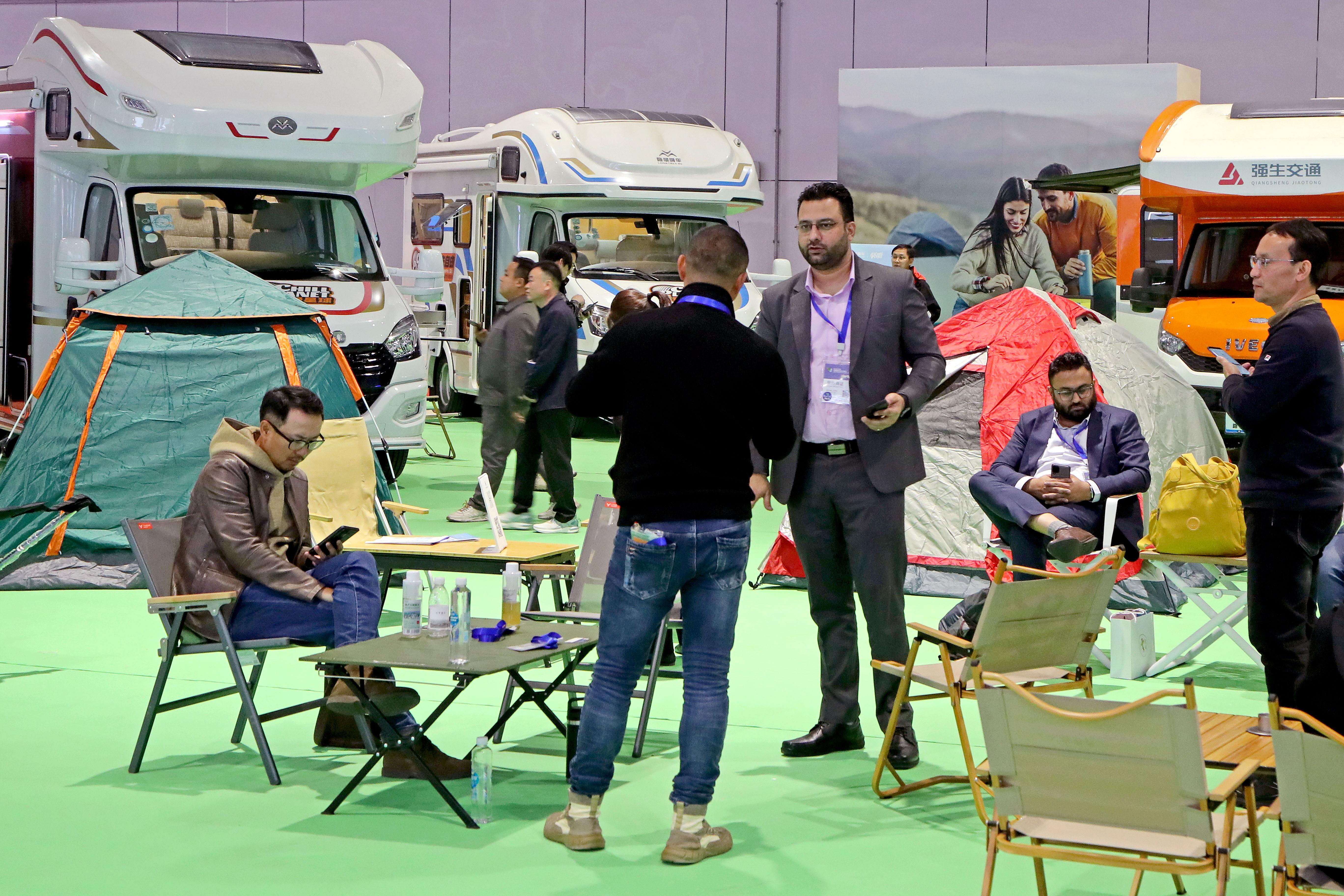 中外展商在露營裝備展區交流洽談