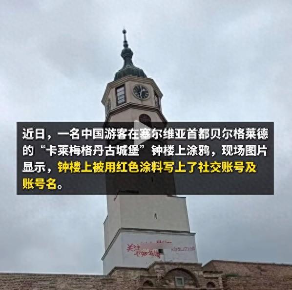 11月18日,有網友曝出,一位中國遊客在塞爾維亞首都貝爾格萊德的“卡萊梅格丹古城堡”鐘樓上塗鴉。現場圖片和視頻顯示,鐘樓上被用紅色塗料寫上關注的社交賬號及賬號名。