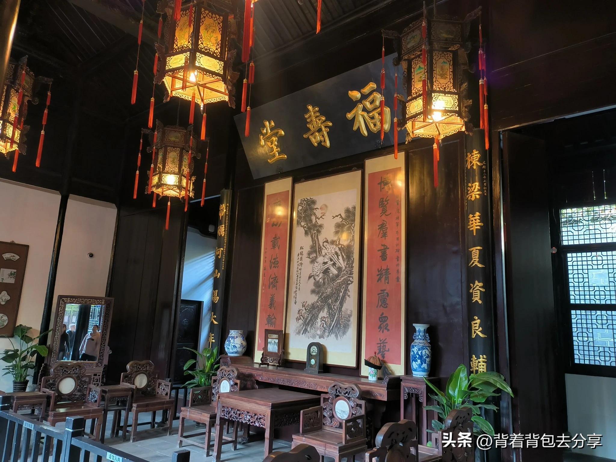 十分鐘左右,來到李鴻章故居,分爲東西兩院,而入口處這邊是故居的西院,由南向北依次爲大門.前廳.中廳和走馬樓,東院爲淮軍展館,首先,先從西院開始遊覽,在前廳正中是一座屏風,上方高懸一塊匾額,上書鈞衡篤祜四個豐筋多力的金色大字,意爲李鴻章官顯福厚,而這四個字,是李鴻章七十大壽時,光緒皇帝御筆所賜,用以褒獎他對大清帝國所做的功績