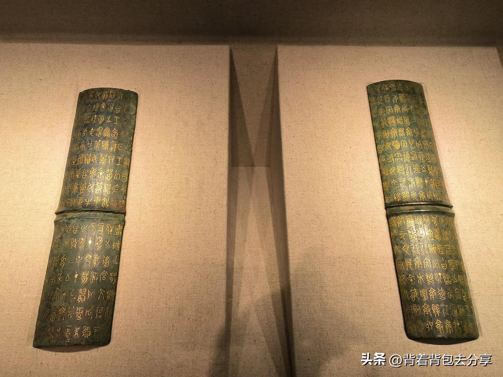 鄂君啓金節,1957年壽縣邱家花園出土,楚懷王頒發的免稅通行證,是我國最早的免稅通關憑證,銘文共計312字,金節用銅鑄成,文字錯金,因形似劈開的竹節,故名節,這種車節與舟節,鄂工藝採用的金銀錯技術,極難仿製,迄今爲止僅此一見,因而極爲珍貴