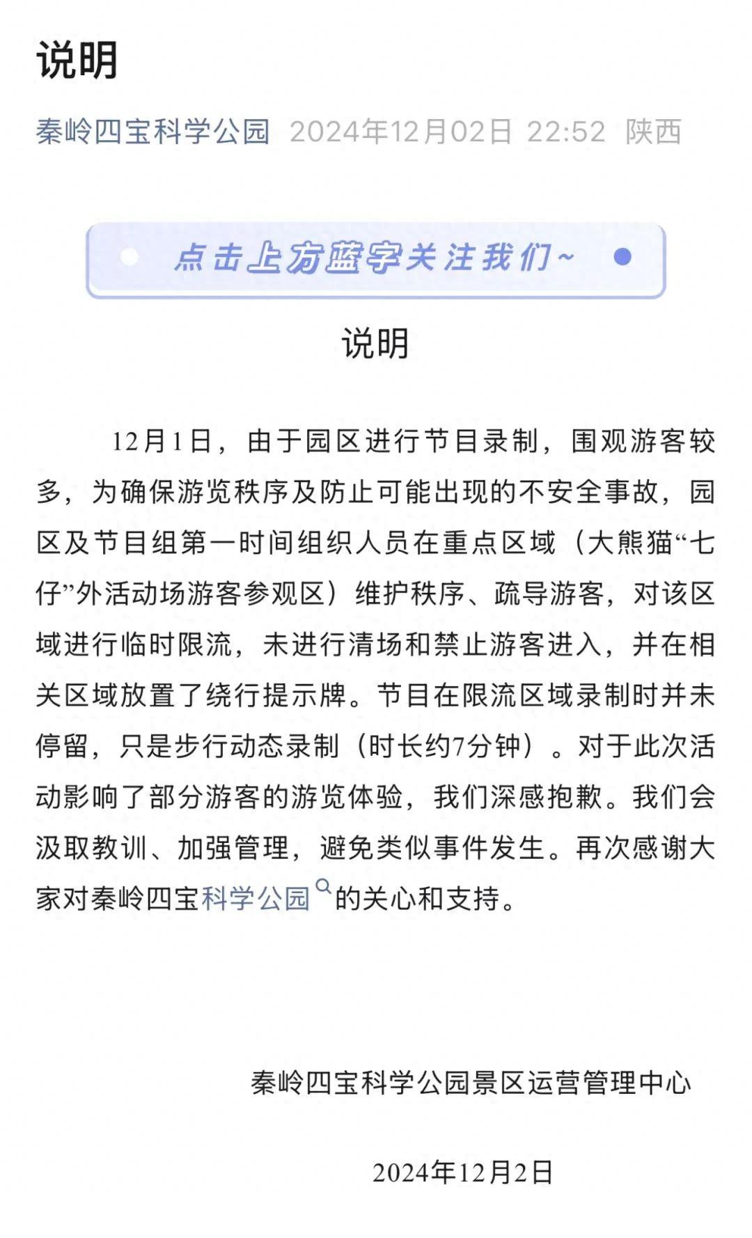 12月2日晚,陝西秦嶺四寶科學公園景區運營管理中心發佈說明稱,園區及節目組第一時間組織人員在重點區域(大熊貓“七仔”外活動場遊客參觀區)維護秩序、疏導遊客,對該區域進行臨時限流,未進行清場和禁止遊客進入,並在相關區域放置了繞行提示牌。節目在限流區域錄製時並未停留,只是步行動態錄製(時長約7分鐘)。