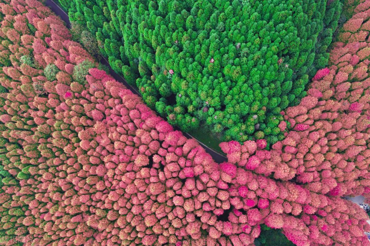山王坪,這是重慶的網紅景點之一,由水杉林和柳杉林構成的“平分秋色”的景觀堪稱國內獨一無二的經典,航拍最震撼,注意附近有軍事禁區,如果不想進景區就在景區大門往裏飛不遠就能看到下面的景觀。