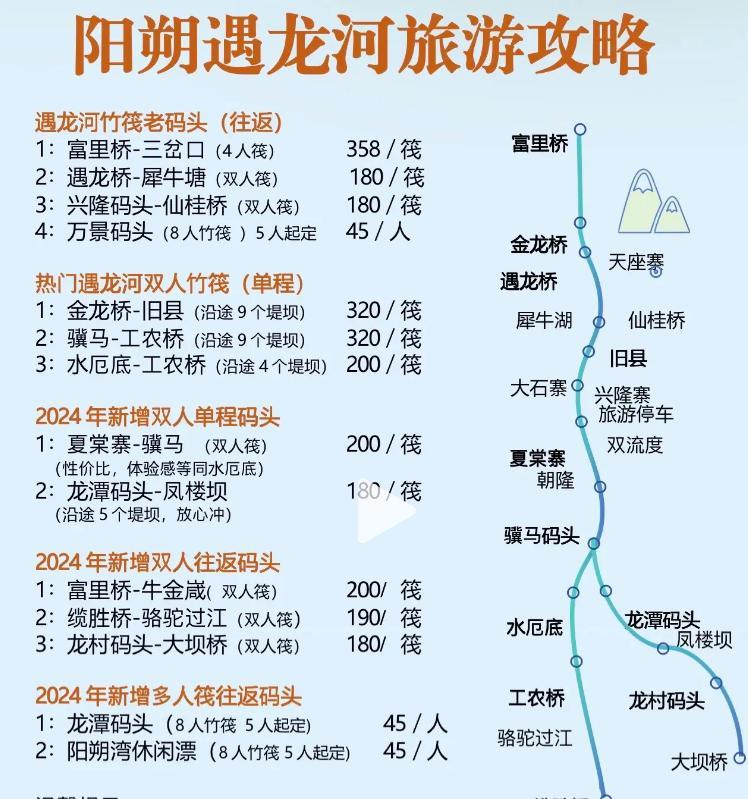 遇龍河漂流分上下兩段,全長15公里,分上下兩段,全程漂流最少要4個多小時,時間長費用高,可以選其中的一段,小編推薦上段,自然風貌比較原始,有九段堤壩,應該說是遇龍河的精華,距離陽朔最美的古橋富里橋也最近,2人筏320元。