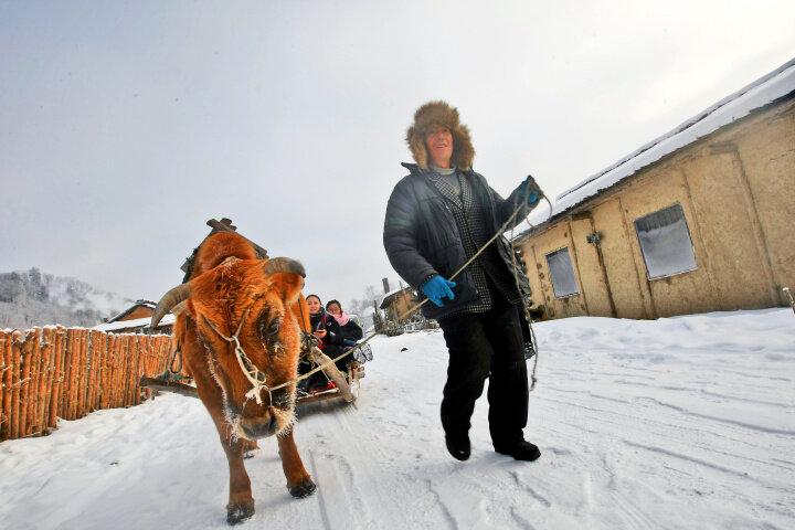 遊客在錦江木屋村體驗雪地牛拉爬犁 記者 陳晨 攝