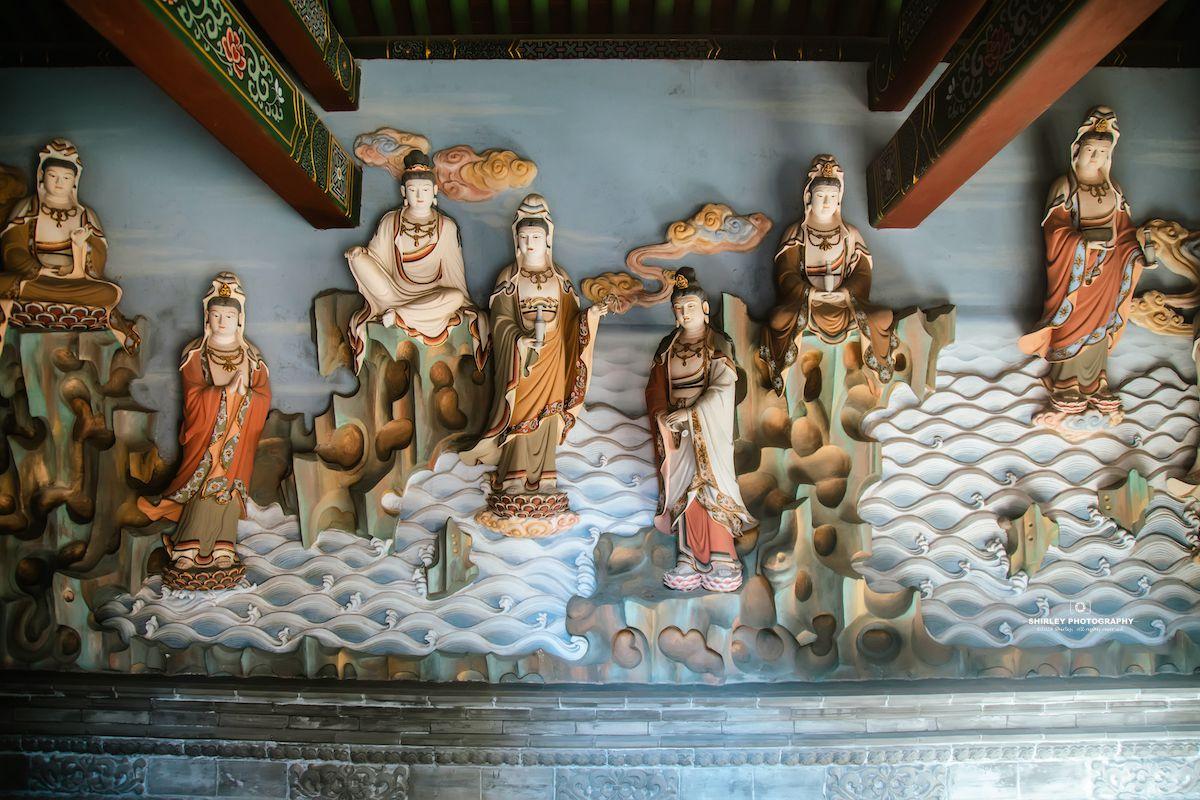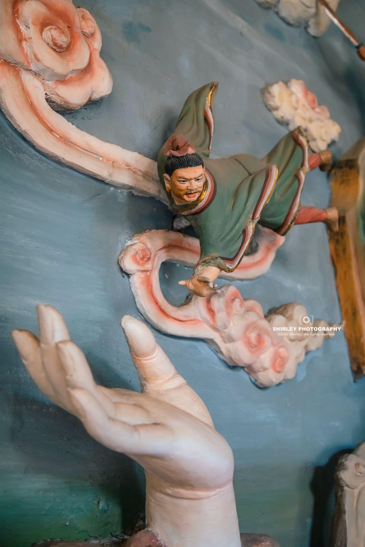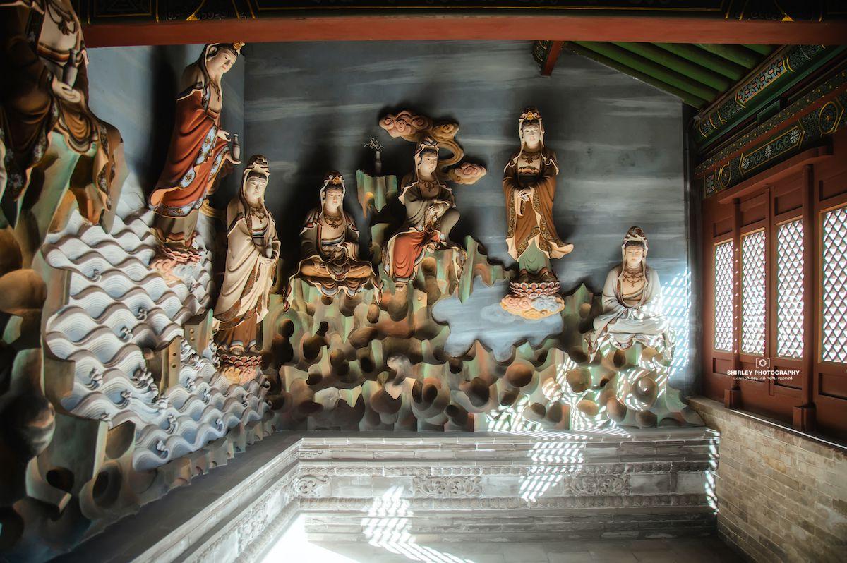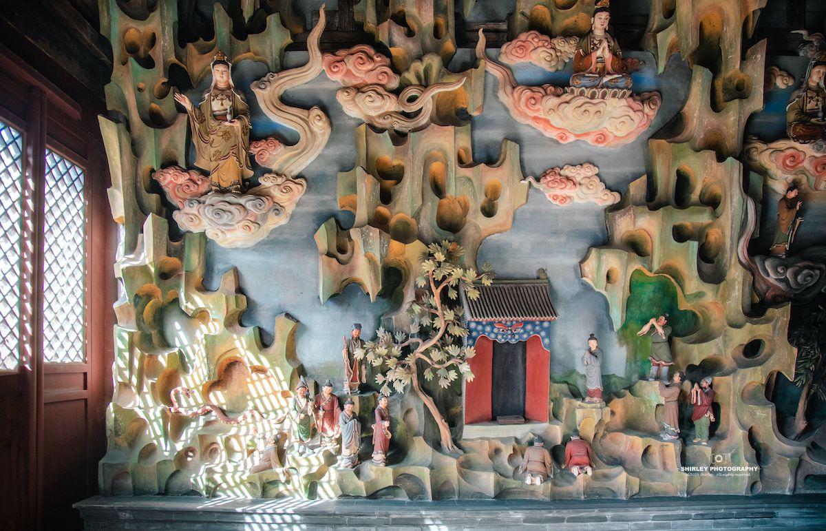 東西配殿亦能欣賞到“十六應化觀音”貼壁掛棚懸塑,不少細節很值得駐足細品,有陽光照進殿內時更是美輪美奐,空間彷彿有了神性。這些懸塑雖是後人所作,但是同樣造型靈動惟妙惟肖,復建得很有誠意。