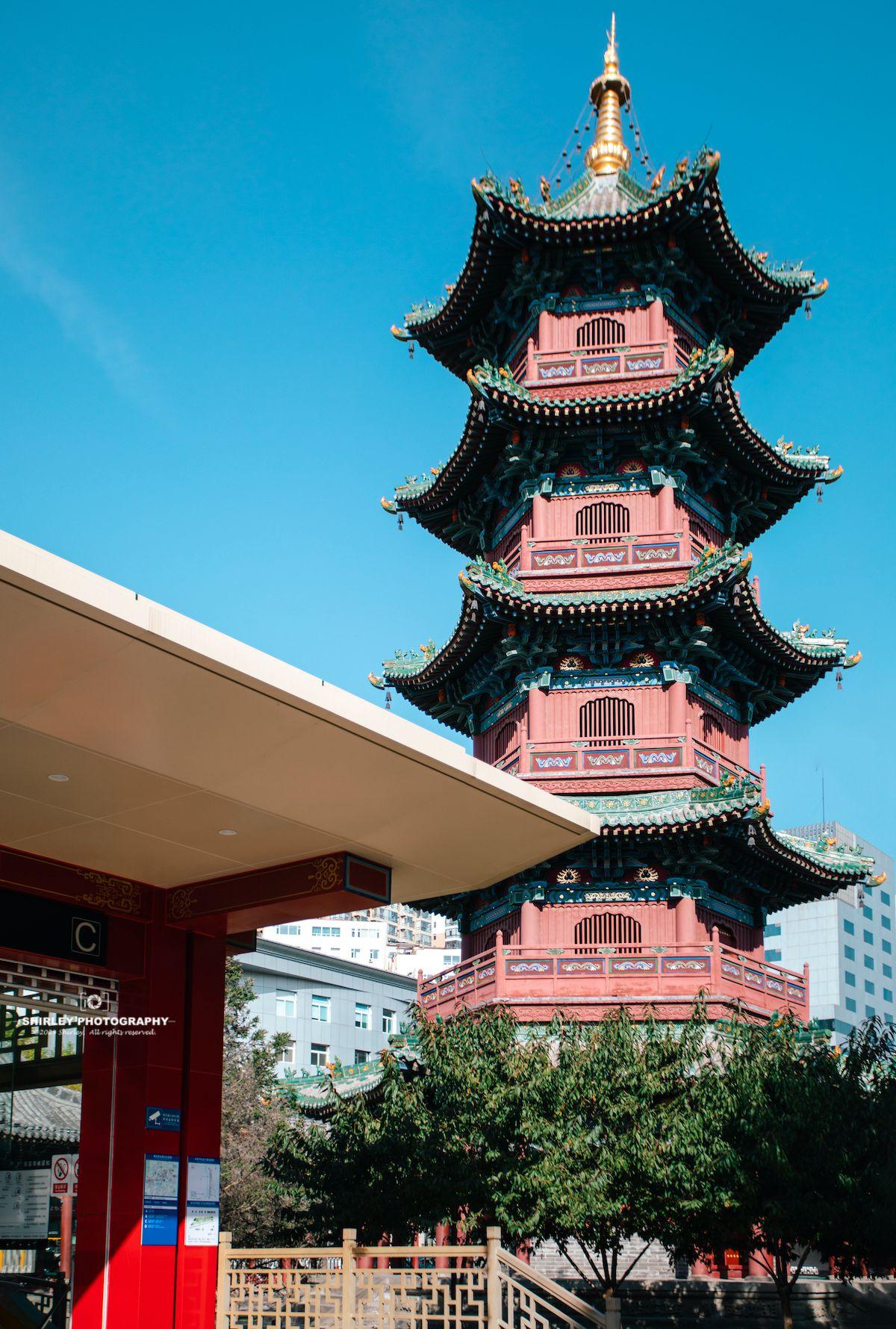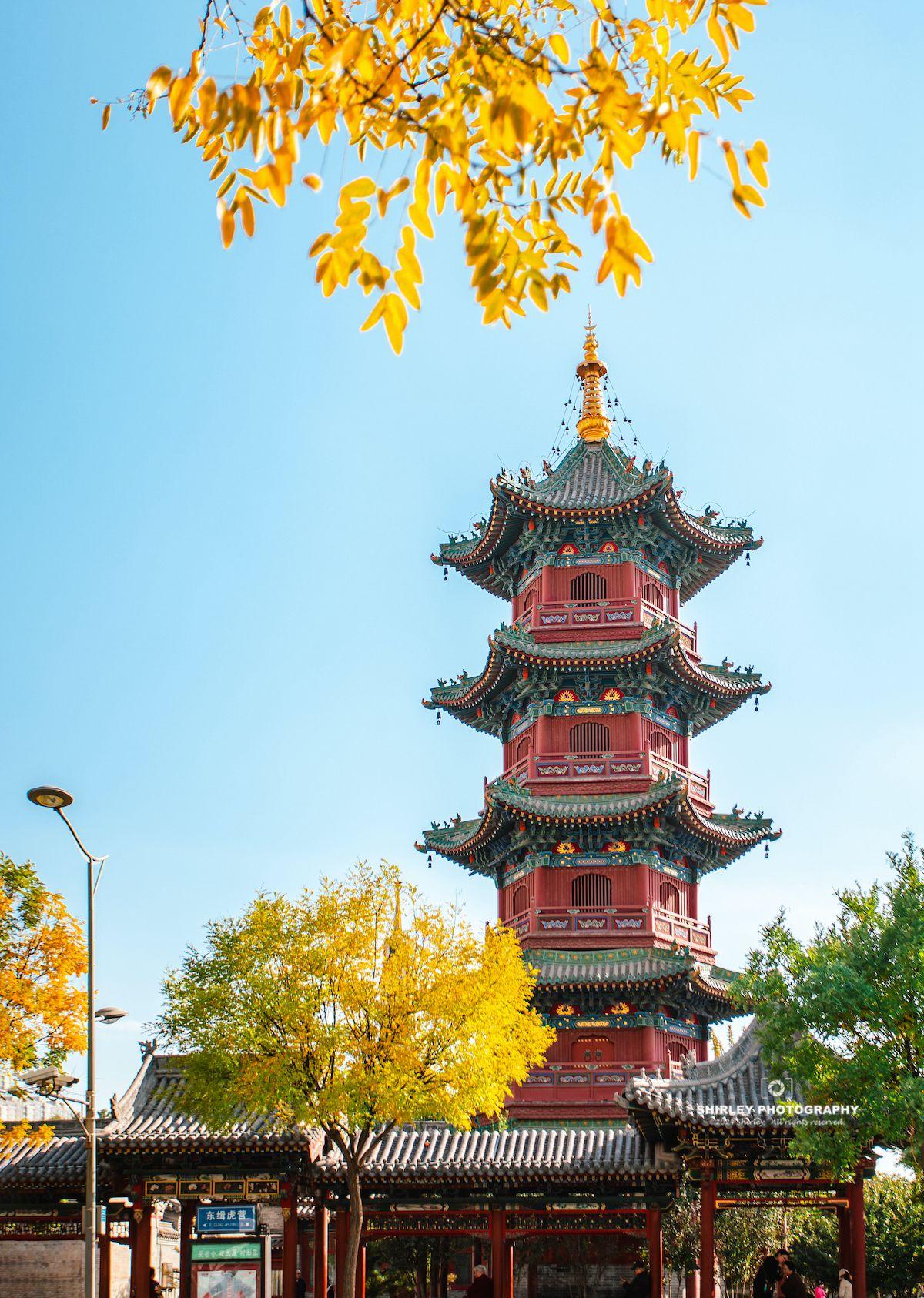 圓通寺圍牆外,有一座仿古木塔屬於同一片建築羣,從地鐵緝虎營站C口出來就能看見。這座木塔的塔剎使用了價值不菲的“金頂”,用金屬銅打造而成,據說花費了10多萬人民幣。目前木塔不開放,只能外圍參觀;塔下設了一圈雕樑畫棟的遊廊,同爲仿明建築。紅窗綠瓦金頂在陽光下格外耀眼矚目,深秋時有黃葉的映襯,那更是馬路上驚豔一景。