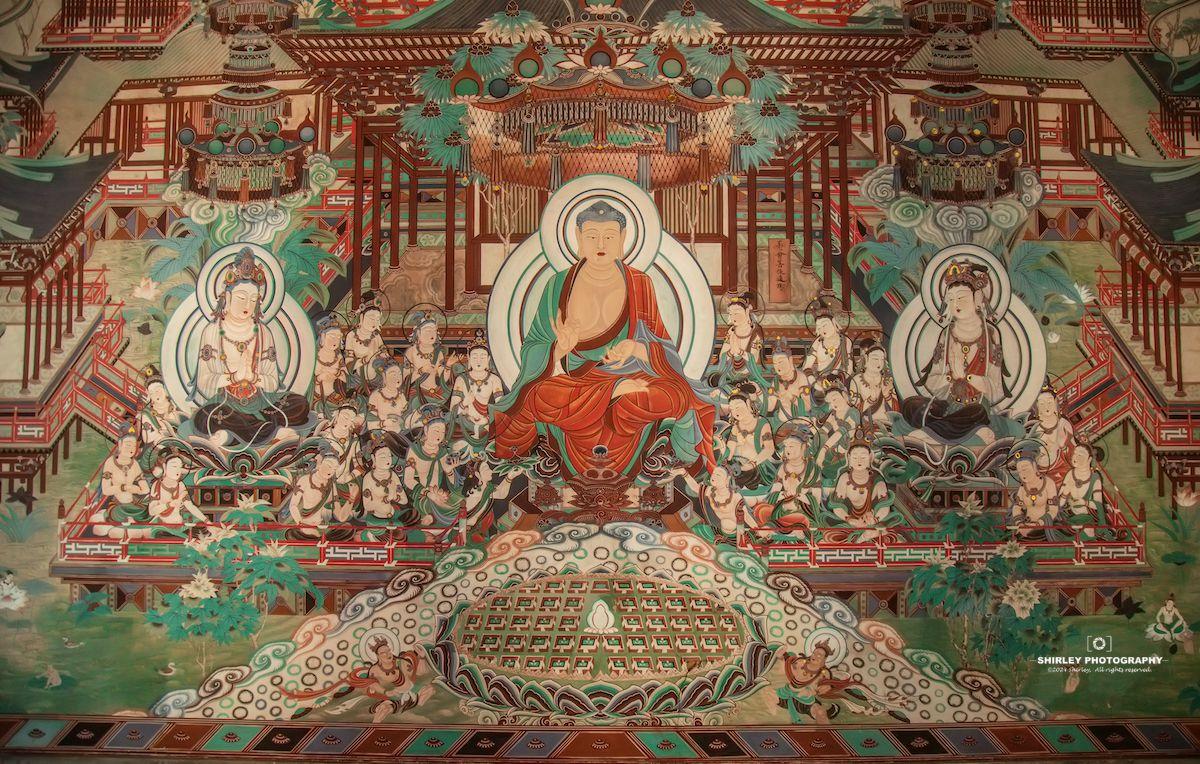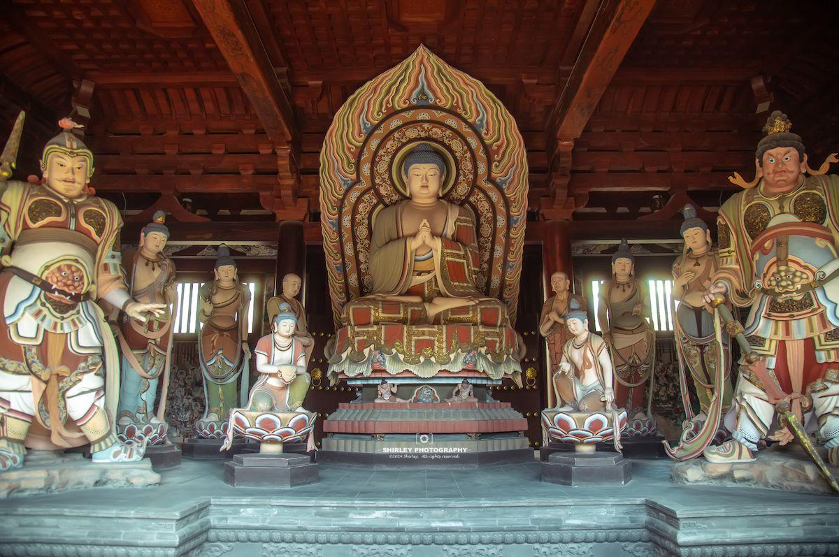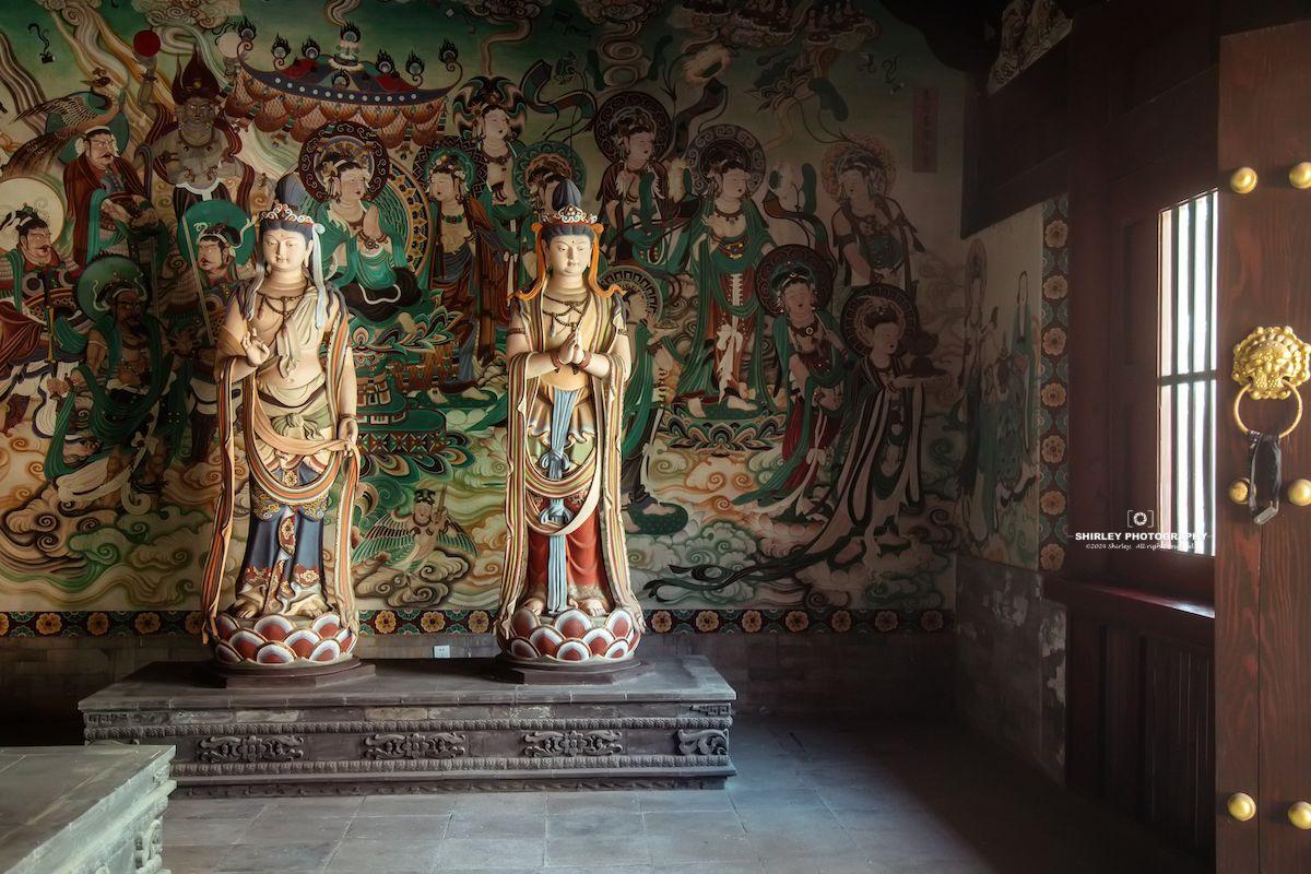 各殿閣內的大幅經變畫、尊像畫、故事畫均爲唐代風格,都是由中央美術學院傳統壁畫創作組歷時3年繪製而成的。塑像參考五臺山佛光寺東大殿、南禪寺大殿和敦煌莫高窟中的造像。佛陀菩薩們沐浴着斜照進殿內的陽光稽首來迎,讓人彷彿置身於盛唐時的敦煌。除了主殿普光殿,兩側的普賢殿、文殊殿內也都有彩塑和壁畫。